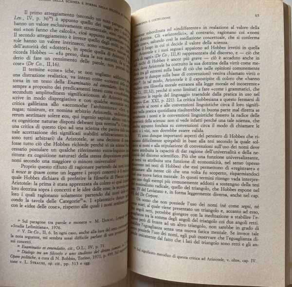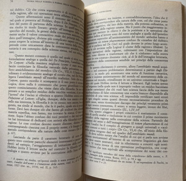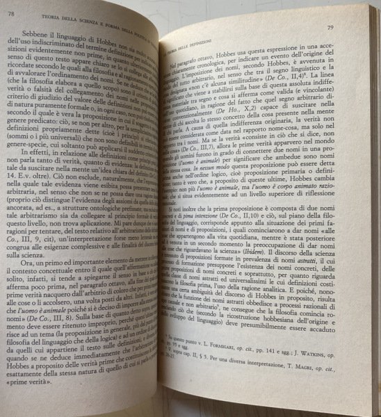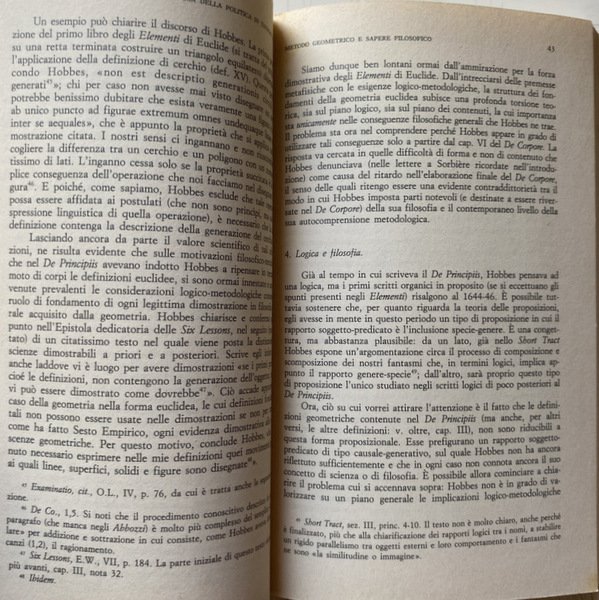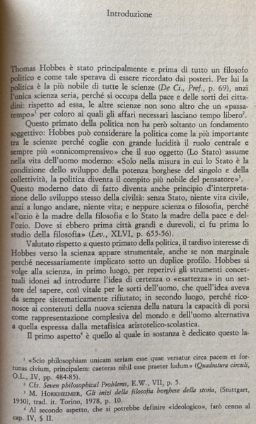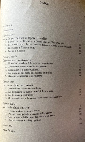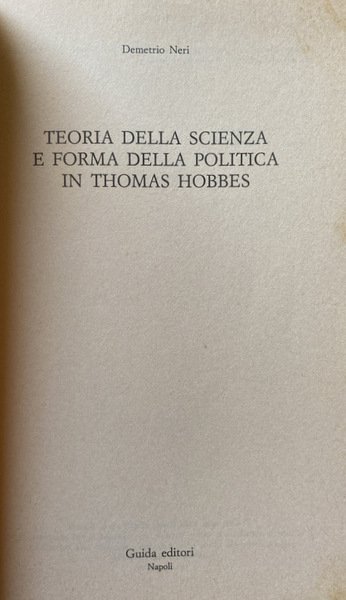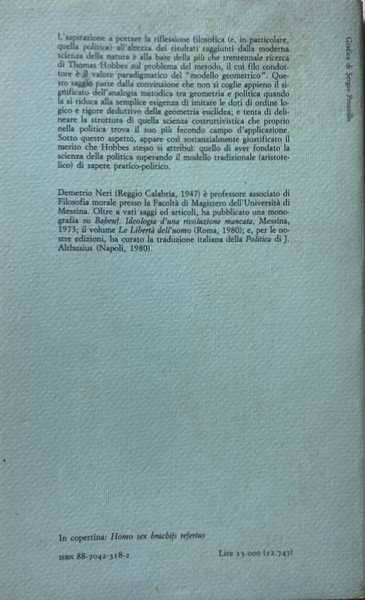 Soggetti: Scienze politiche, Storia, Filosofia, Thoma Hobbes, Concetti, Stato, Leviatano, Matematica, Logica, Geometria euclidea, Aristotele, Metodo, Costruttivismo, Natura, Scienze filosofiche, Principi, Saperi, Teorie, Antropologia, Saggistica, Etica, Libertà, Società, Scienze sociali, De Corpore politico, De Homine, Elementi, Legge naturale, Thomas White, Euclide, Diltey, Galileo Galilei, Formigari, Hoffmann, Kant, Horkheimer, Cartesio, Dal Pra, Bobbio, Bowle, Bramhall, Cavalieri, Cambiano, Ilting, Koselleck, Levi, Magri, A. Pacchi, R. Polin, Platone, Proclo, Riedel, W. Rod, Lévy-Strauss, Leibniz, Spinoza, Locke, J. Wallis, F. Tonnies, H. Warrender, H.G. Zeuthen, Deismo, Materialismo moderno, Studi culturali, Bibliografia, Opere generali, Progresso scientifico, Nominalismo, Seicento inglese, Empirismo, Analitica, Linguistica, Linguaggio, Segni, Collezioni matematiche, Teoremi, Ipotesi, Archimede, Lettera ad Eratostene, Cantor, Opere latine, Diritto, Critica, Libri Vintage Fuori catalogo, Political sciences, History, Philosophy, Concepts, State, Leviathan, Mathematics, Logic, Euclidean geometry, Aristotle, Method, Constructivism, Nature, Philosophical sciences, Principles, Knowledge, Theories, Anthropology, Nonfiction, Ethics, Freedom, Society, Social sciences, Elements, Natural law, Euclid, Descartes, Plato, Proclus, Deism, Modern materialism, Cultural studies, Bibliography, General works, Scientific progress, Nominalism, English seventeenth century, Empiricism, Analytics, Linguistics, Language, Signs, Mathematical collections, Theorems, Hypotheses, Archimedes, Letter to Eratosthenes, Latin works, Law, Criticism, Out of print books