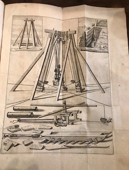 Folio (cm. 35,5), VIII-270 pp., 1 c.nn. (bianca). Con 6 illustrazioni calcografiche n.t. e 13 tavole più volte ripiegate f.t. Capilettera e finalini n.t. Legatura coeva in mz. pelle con fili, fregi e titolo in oro su tassello in pelle al ds. (abrasioni alle carte dei piatti). Tagli gialli. Lievi, sporadiche fioriture, peraltro esemplare in ottimo stato di conservazione e ad ampi margini. Rara edizione originale. Provenienza: collezione Moretti, Roma (ex libris al frontespizio). Cicognara (n. 562): ‘. trattasi la materia per costituire un buon pratico, e non perdonsi di vista tutte le istruzioni teoriche.’; Olschki, Choix, 17558; Riccardi I, 134; Rossetti, 6829.