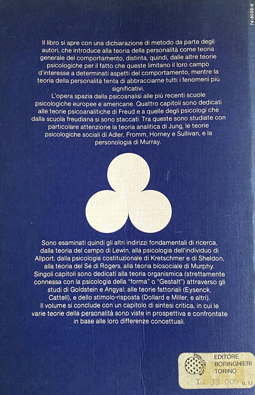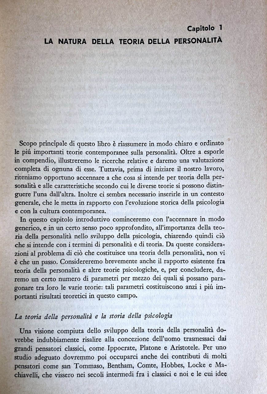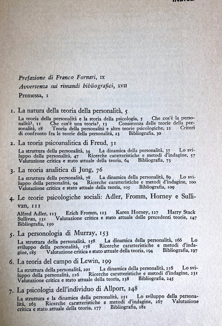 Sono esaminati quindi gli altri indirizzi fondamentali di ricerca, dalla teoria del campo di Lewin, alla psicologia dell'individuo di Allport, dalla psicologia costituzionale di Kretschmer e di Sheldon, alla teoria del Sé di Rogers, alla teoria biosociale di Murphy. Singoli capitoli sono dedicati alla teoria organismica (strettamente connessa con la psicologia della "forma" o "Gestalt") attraverso gli studi di Goldstein e Angyal; alle teorie fattoriali (Eysenck, Cattell), e dello stimolo-risposta (Dollard e Miller, e altri). Il volume si conclude con un capitolo di sintesi critica, in cui le varie teorie della personalità sono viste in prospettiva e confrontate in base alle loro differenze concettuali.