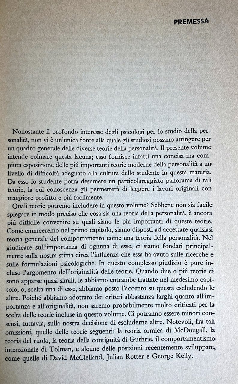Il libro si apre con una dichiarazione di metodo da parte degli autori, che introduce alla teoria della personalità come teoria generale del comportamento, distinta, quindi, dalle altre teorie psicologiche per il fatto che queste limitano il loro campo d'interesse a determinati aspetti del comportamento, mentre la teoria della personalità tenta di abbracciarne tutti i fenomeni più significativi. L'opera spazia dalla psicoanalisi alle più recenti scuole psicologiche europee e americane. Quattro capitoli sono dedicati alle teorie psicoanalitiche di Freud e a quelle degli psicologi che dalla scuola freudiana si sono staccati. Tra queste sono studiate con particolare attenzione la teoria analitica di Jung, le teorie psicologiche sociali di Adler, Fromm, Horney e Sullivan, e la personologia di Murray.
