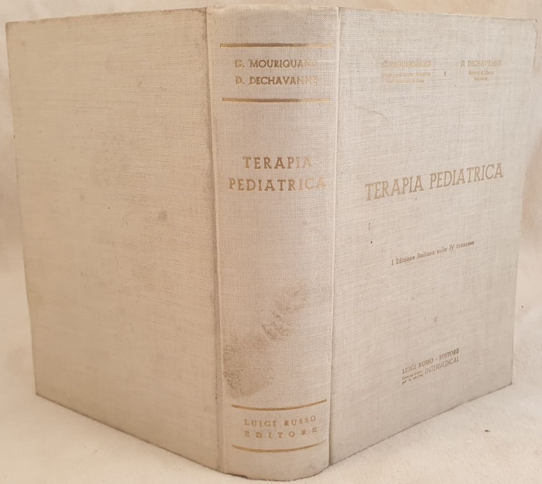 Edizione del 1961 di questo volume di terapia pediatrica scritto da Mouriquand e Dechavanne. Prima edizione italiana a cura di Giovanni Panzera. All'interno: Idroterapia, Refrigerazione e riscaldamento locali, Revulsione, Actinoterapia Interventi elementari, Esami di laboratorio e prove biologiche, Alimenti e regimi del lattante, Crescita e sviluppo del bambino, Trattamento delle malattie, del bambino ecc. In ottime condizioni. Copertina in tela editoriale in ottime condizioni generali con lievi usure ai margini e dorso. Legatura in buone condizioni. All'interno le pagine si presentano in ottime condizioni con rare fioriture. In 8. Dim. 22x17 cm. Pp. 907+(1).Edition of 1961 of this volume of children therapy by Mouriquand and Dechavanne. First italian edition by Giovanni Panzera. In very good conditions Cloth editorial cover in very good general conditions slightly worn in the edges and spine. Binding in good conditions. Inside pages are in very good conditions with occasional foxings. In 8. Dim. 22x17 cm. Pp. 907+(1).