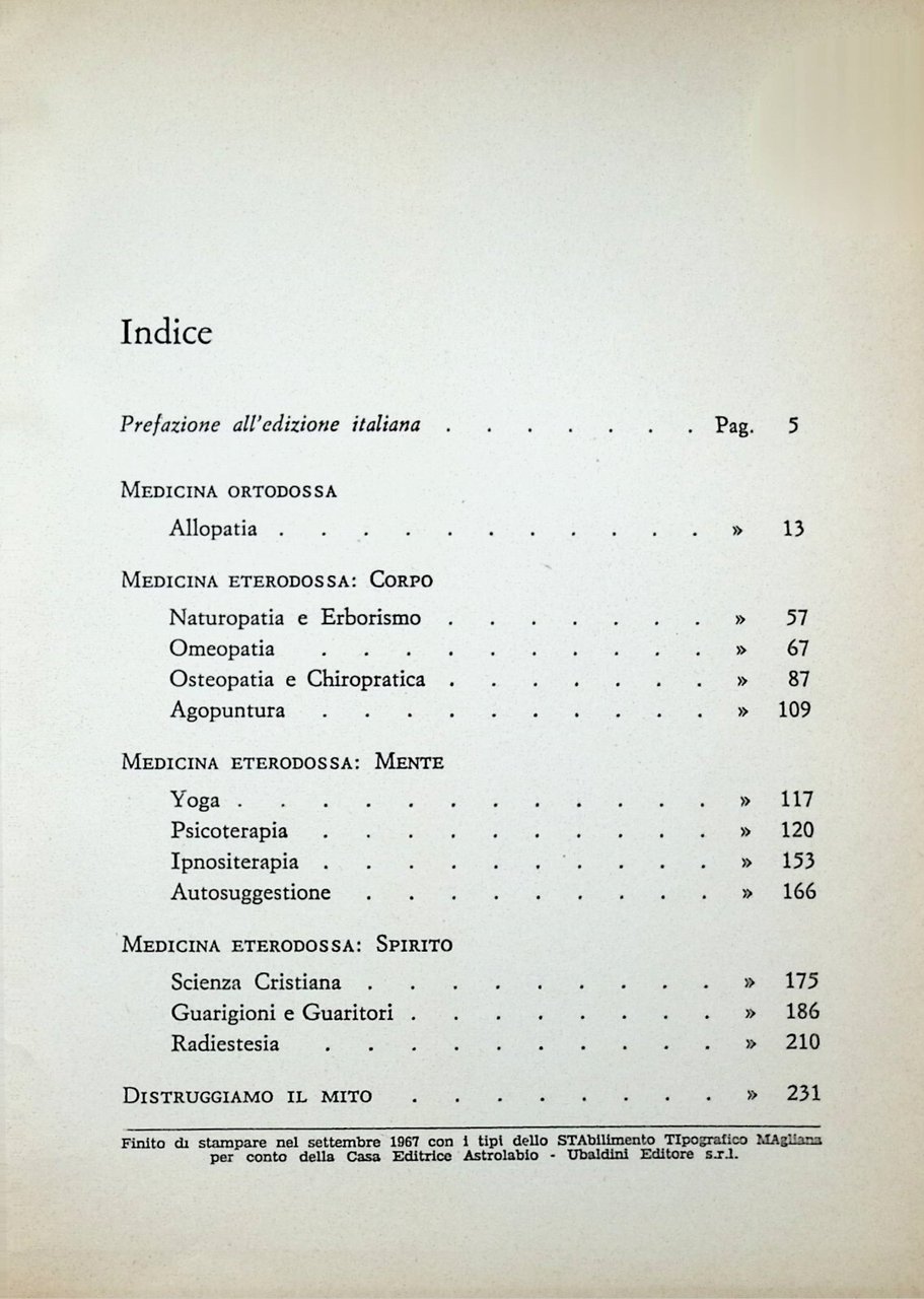 Astrolabio, 1967 Naturopatia, erborismo, omeopatia, osteopatia, chiropratica, agopuntura, yoga, psicoterapia, autosuggestione, ipnositerapia, guaritori, radiestesia. in 8^, 240 pp. Condizioni: discrete, minimo ingiallimento 1H-3-1