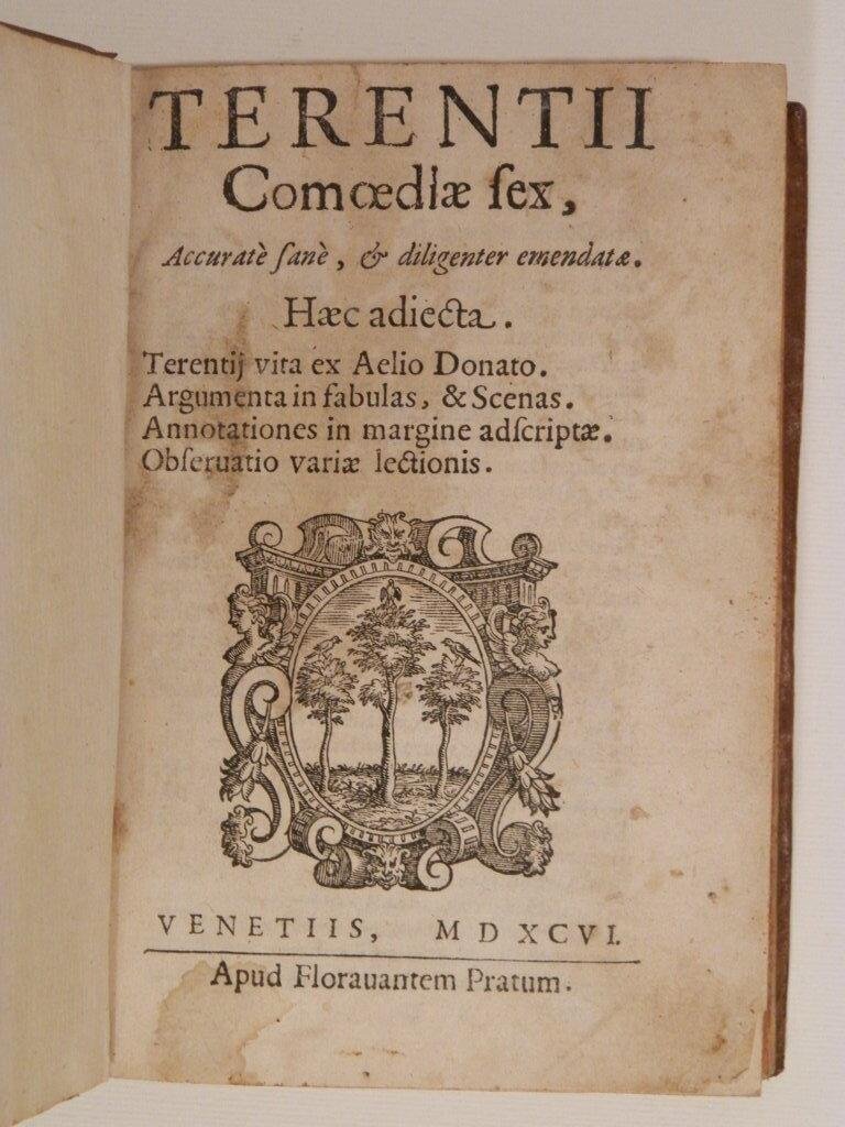 8°,mm 140x95, carte numerate 175, (1), alcuni capilettera istoriati, contiene la vita di Terenzio di Elio Donato e un commento di Antonio Mureto. Legature settecentesca in piena pelle con titolo e fregi in oro al dorso, tagli rossi, lieve imbarcatura dei piatti, nel complesso molto ben conservato. Ex libris araldico Dominici de Advocati Comitis Odelli equitis benensis. Una copia censita nelle biblioteche italiane.. *** TUTTI I NOSTRI LIBRI SONO VISIBILI PREVIO CONTATTO MAIL O TELEFONO NELLA NUOVA SEDE DI MILANO: LIBRERIA COSMOPOLIS, VIA JOMMELLI, 22. ***