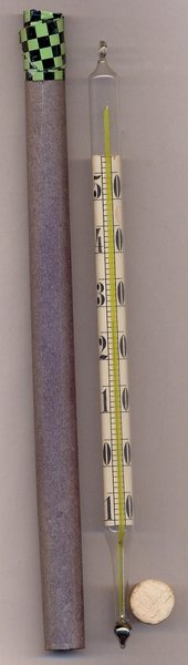 Termometro, in vetro, da laboratorio chimico. Graduato da meno 10 a più 50 gradi centigradi. Lungo cm. 25. Custodia in cartoncino.