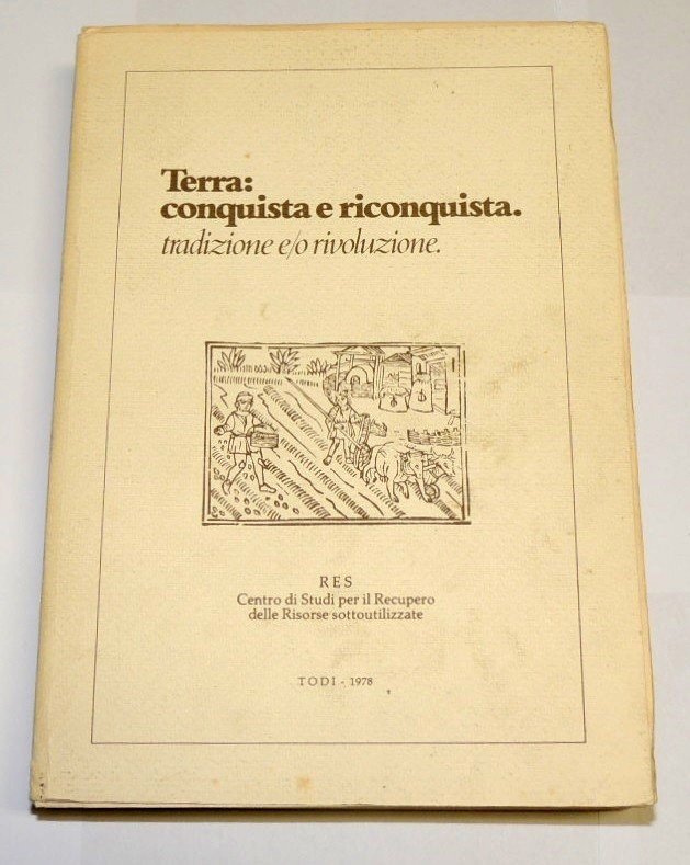 Terra: conquista e riconquista. Tradizione e/o rivoluzione, Res Centro di Studi per il Recupero delle Risorse sottoutilizzate, Todi 1978, pp. 421, ill. b.n., cm 24, br. ed. Atti del Convegno Acque e suolo: recupero di risorse sottoutilizzate, 23-24-25 giugno 1977, Todi, Palazzo del Capitano del Popolo, organizzato dalll'Anic e dalla Regione Umbria per un'analisi dei problemi dell'agricoltura, dello sviluppo e del territorio. Brossura un po' sporca, per il resto ottime condizioni.