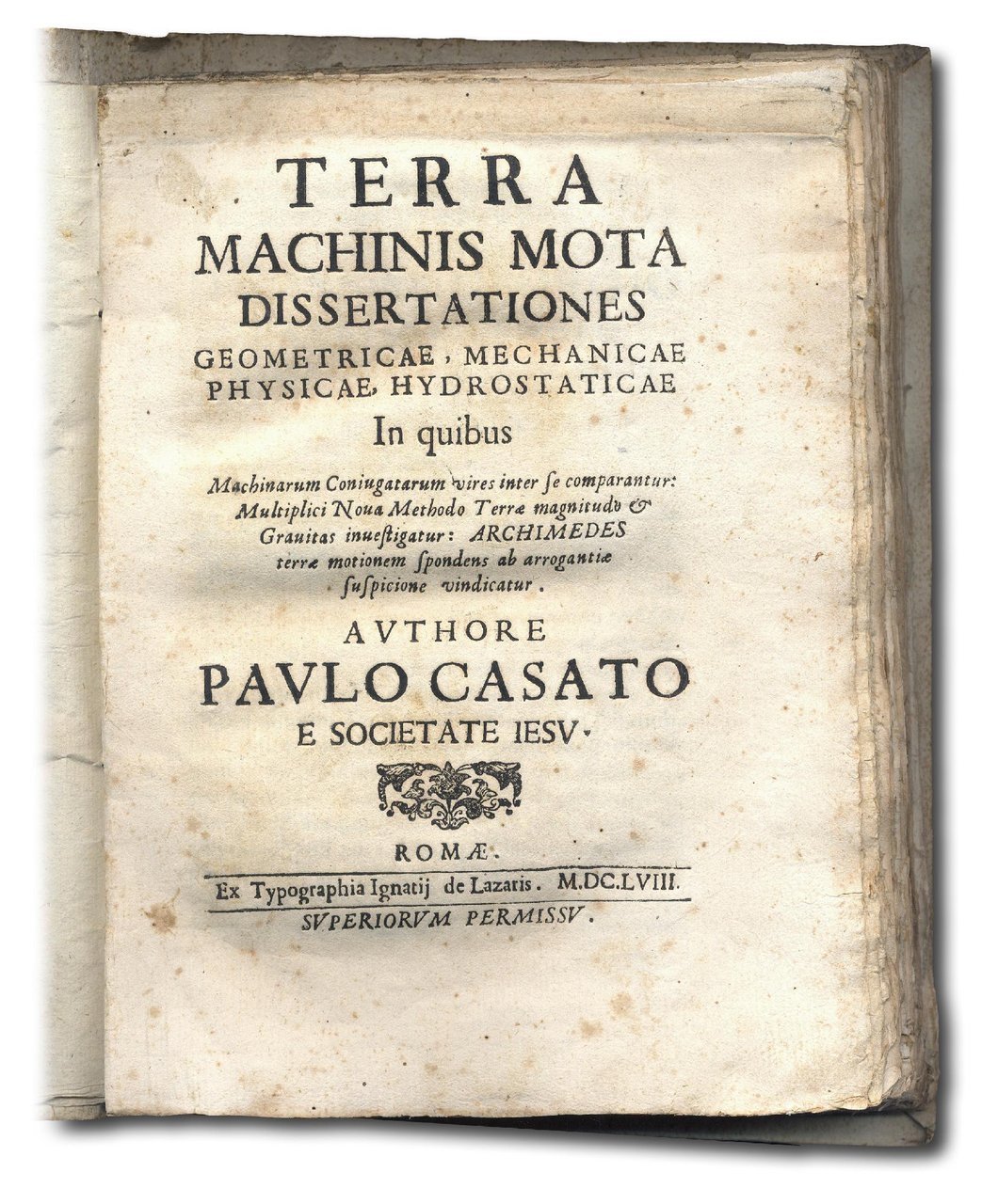 >in-4, pp. (8), 227, (5). Legatura coeva cartonato rustico. Con una tavola inc. in rame ripieg. f.t., svariati diagrammi e figure xilogr. n.t., di cui una a piena pag., con soggetto di macchine, figure geometriche e astronomiche. Dedica dell'A. al patrizio veneto Giovanni Giorgi. Una prima edizione parziale uscì in due parti nel 1655. Questa seconda edizione, notevolmente aumentata nel testo e nelle note, è divisa in cinque parti. L'opera si presenta sotto forma di dialogo immaginario tra Galileo, Guldin, e Mersenne, che trattano rispettivamente il confronto fra le forze delle macchine, la gravità terrestre, i vari modi per determinare la massa terrestre, il movimento della terra e la separazione tra terre e acque. L'A. inizia parlando della macchina di Archimede che avrebbe sollevato il mondo, investiga poi sulla gravità del globo terracqueo e sui metodi con i quali si può indagare sulla grandezza della Terra, al fine di ricavare dalla mole il peso e da qui la macchina che, in proporzione, risponda alla gravità da muovere. Il gesuita Paolo Casati (Piacenza 1617- Parma 1707) fu insegnante di matematica e teologia a Roma, inviato in Svezia col compito di persuadere la regina Cristina ad abbracciare la religione cattolica ed infine rettore dell'Università di Parma. Esemplare genuino, a pieni margini con barbe (brunitura della carta su alcuni fogli e sporadiche fioriture). Manca ad Honeyman e Horblit. Cinti 134. Riccardi I, 270. De Backer-Sommervogel II, 800.3.
