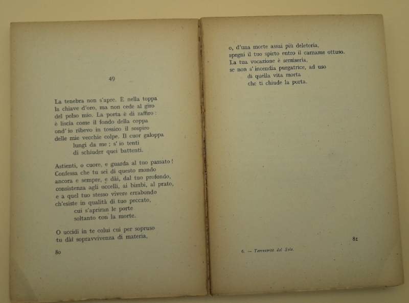 In 8', br. edit., pp. 238. Intonso. pieghe e bruniture al dorso, fioriture ai piatti e piega all'ang. inf., strappo lungo la costa al piede del dorso(foto)interni in buono stato, due piccoli strappetti al margine inferiore dell'occhiello, del frontespizio e della pagina seguente, bruniture e segni el tempo, intonso. Luogo di pubblicazione FirenzeEditore VallecchiAnno pubblicazione 1927Materia/Argomento Poesia ***Due to bureaucratic reasons, books dated over 70 years old cannot be immediately exported, please contact us before placing the order.***