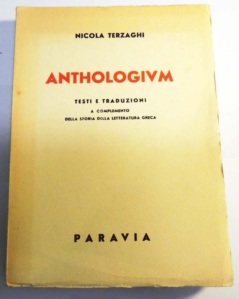 Nicola Terzaghi, Anthologium. Testi e traduzioni a complemento della storia della letteratura greca, G. B. Paravia e C., Torino 1956, quarta rist. della prima ed., pp. XI, 466, cm 23, br. ed. Lievissimi segni del tempo alla brossura, per il resto perfetto.
