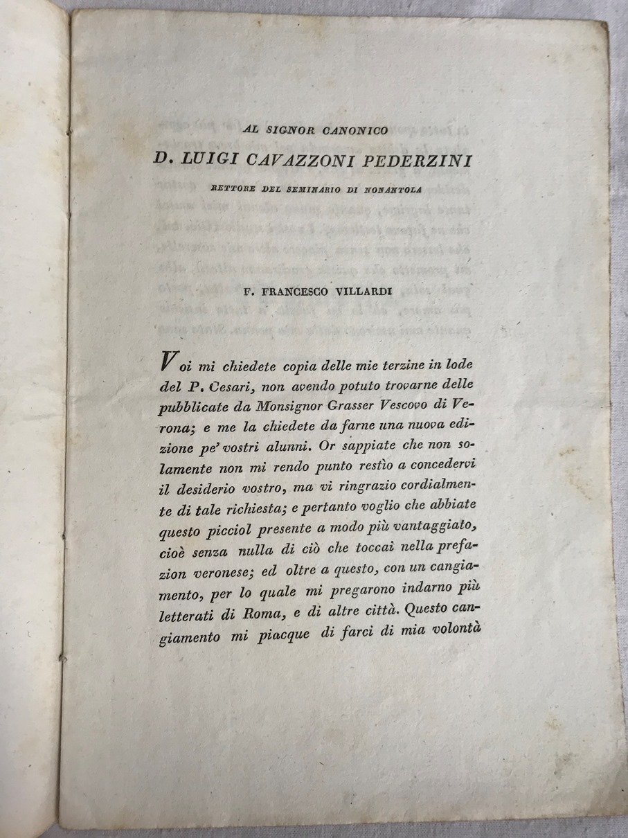 Fascicolo in 8, privo di brossura, frontespizio, dedicatoria, occhiello, 14 pp., bianca finale. Seconda edizione di questo componimento del letterato e poeta veronese (la prima stampata a Verona) su richiesta e dedicata al Rettore del seminario di Nonantola. Stampata su bella carta spessa, a grandi margini. In bllo stato di conservazione.