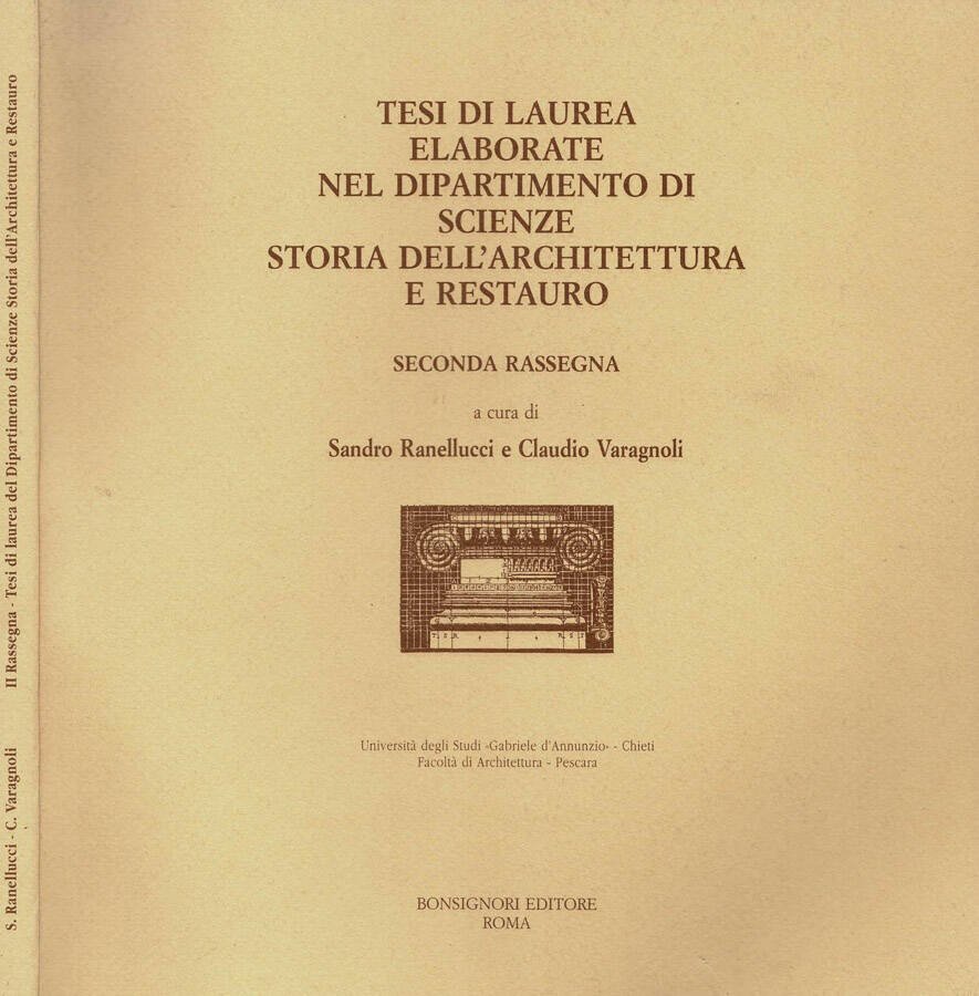 Volume in brossura contenente i materiali della seconda rassegna organizzata dall'Università degli Studi " Gabriele D'Annunzio " di Chieti, Facoltà di Architettura, copertina morbida monocolore con alette, in ottime condizioni, altrettanto buono risulta lo stato dei fogli, integri e privi di imperfezioni, testi arricchiti da un possente materiale illustrativo. N. pag. 166.