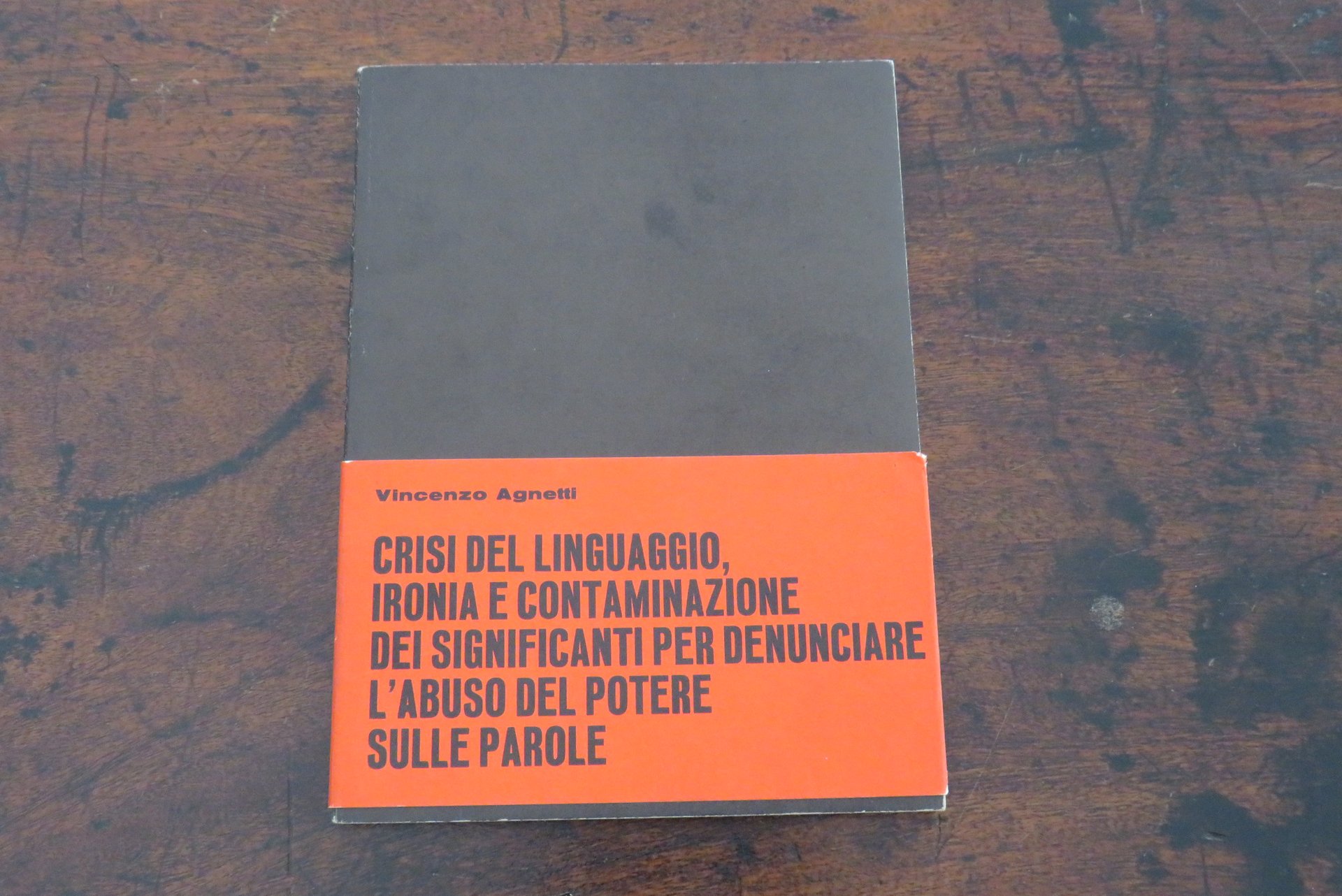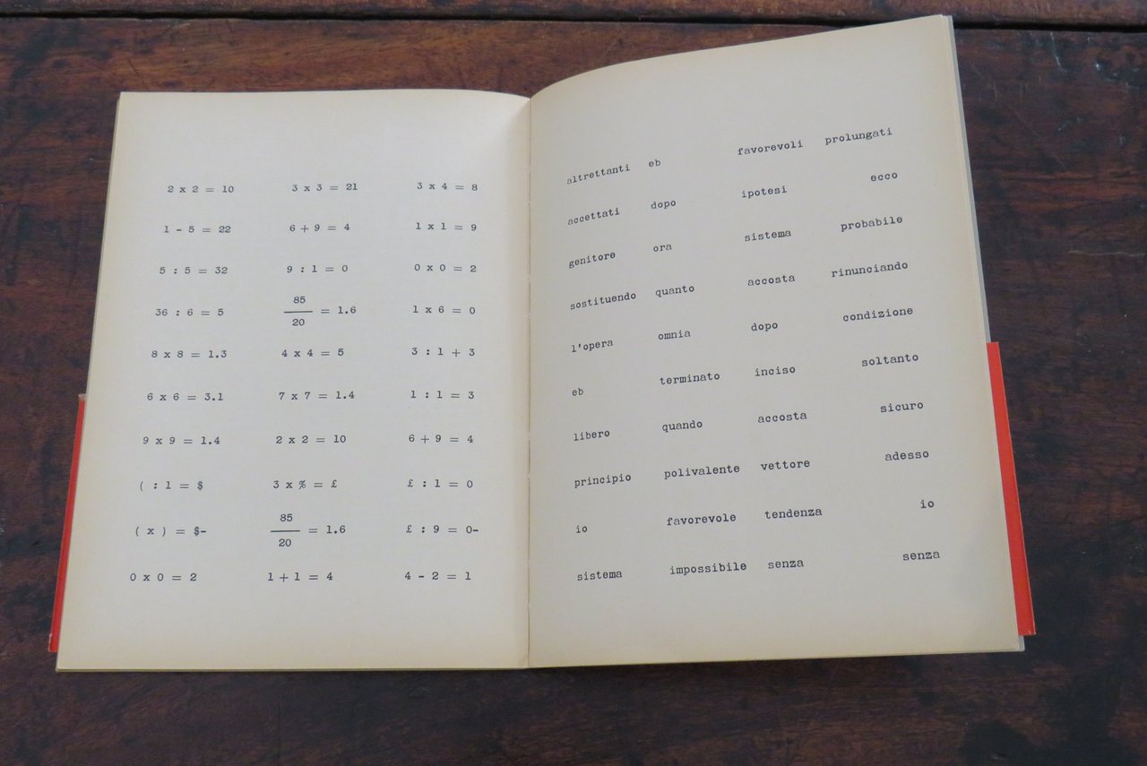 Milano, Giampaolo Prearo Editore, 1972. In -8 (mm. 160,8x230), pp. 88 non numerate, illustrate con segni grafici lineari nel testo. Cartonatura editoriale muta al recto e al verso, di colore nero, con autore e titolo in bianco al dorso. Collana "Preariana", a cura di Tommaso Trini. Con grande fascetta editoriale originale di colore rosso, con autore e un testo stampato in nero al recto: "Crisi del linguaggio, ironia e contaminazione dei significati per denunciare l’abuso del potere sulle parole". Testo di sette pagine, su due colonne, di Tommaso Trini, "Pausa alla lettura", stampato su carta sottile di colore giallo tenue. Con 7 tavole, di cui 5 illustrate al recto con puntini neri sulle pagine, le ultime due, una con uno schema di calcolo numerico, l’altra con quaranta parole disposte in quattro colonne da dieci. All’interno due cartoncini plastificati di colore bianco, a forma di segnalibro, uno con dieci parole disposte in colonna, l’altro con una serie di numeri, disposti su due colonne. Tiratura di 2000 esemplari numerati. Prima edizione. Libro d’artista. Ottimo.