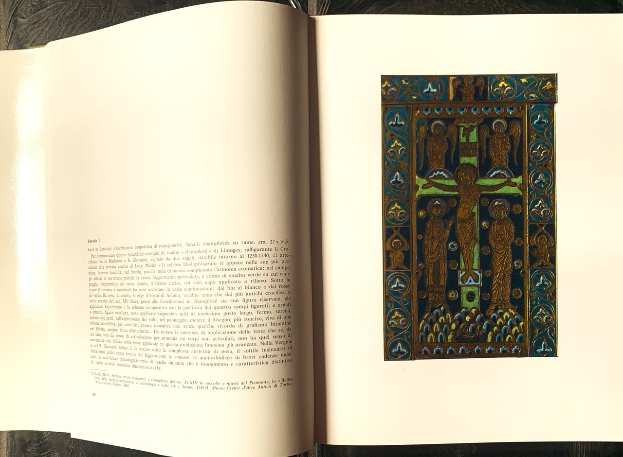I ed. del volume: "Questo libro, promosso dalla Fiat, comprende argomenti trattati dallo stesso autore nelle annuali monografie edite dall'Istituto Bancario San Paolo di Torino per meglio far conoscere i capolavori d'arte e i monumenti storici del Piemonte. Tutti i testi introduttivi e i commenti delle tavole a colori sono però stati riveduti, in vari casi completamente rifatti, e comunque aggiornati con i più recenti studdi. A questa edizione in lingua italiana sono aggiunte quelle in lingua francese, inglese e tedesca, allo scopo di illustrare anche fuori d'Italia aspetti del patrimonio storico-artistico piemontese scelti tra i suoi valori più interessanti e più alti" (nota p. 6). In-4, pp., cart., sovraccoperta con illustrazione a colori al primo piatto (particolare dell'affresco della sala baronale del Castello della Manta, presso Saluzzo (CN), intitolato "I nove Prodi e le nove Eroine", attribuito a Giacomo Jaquerio e aiuto. Il particolare si riferisce all'ottava Eroina, Theuca), cofanetto editoriale in mezza tela verde salvia con i piatti illustarati seppia (primo piatto: Filippo Juvarra, "Fantasia architettonica". Disegno a penna acquerellato, cm 22,5x33,4 - ultimo piatto: Antonio Tempesta, "Torneo nella piazza del Castello di Torino", Torino, Galleria Sabauda). Sguardie illustrate in grigio-verde con il particolare della pianta di Torino delineata da Giovanni Carracha nel 1572. Con illustrazioni in b/n nel testo e illustrazioni a colori e in b/n in tavole f.t. anche ripiegate. Stato buono (lieve stato d'uso del cofanetto - uno strappo di 5 mm ca. al margine superiore del primo piatto della sovraccoperta e altri analoghi al margine superiore del dorso della sovraccoperta) Indice dei capitoli: La Galleria Sabauda di Torino - Palazzo Madama di Torino e il suo Museo - Il Palazzo reale di Torino - Il Castello del Valentino - Il Palazzo Carignano di Torino - Un Palazzo e una villa a Torino - La Palazzina di Caccia di Stupinigi - Dal Jaquerio allo Spanzotti. Gli affreschi di Sant'Antonio di Ranverso, del Castello della Manta, del S. Bernardino d'Ivrea - Tre castelli del Piemonte (il Castello di Fénis in Valle d'Aosta - il Castello di issogne in Valle d'Aosta - Il Castello di Guarene, prov. Cuneo) - Tre abbazie del Piemonte (la Sagra di San Michele delle Chiuse in Valle di Susa, prov. Torino - l'Abbazia di Vezzolano, prov. Asti - l'Abbazia di Staffarda, prov. Cuneo) - Il Sacro Monte di Varallo - Capolavori a Vercelli e a Casale - Conclusione: Barocco Piemontese.
