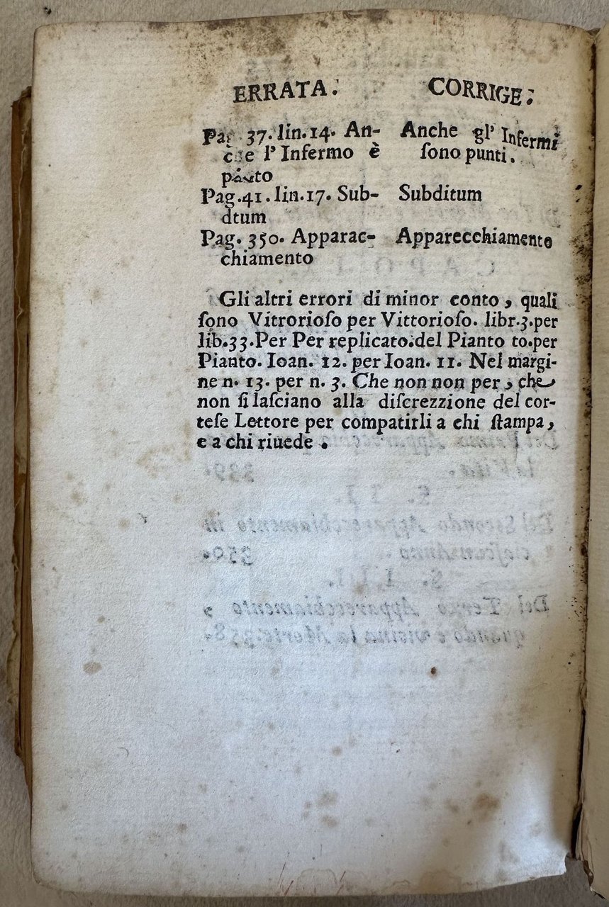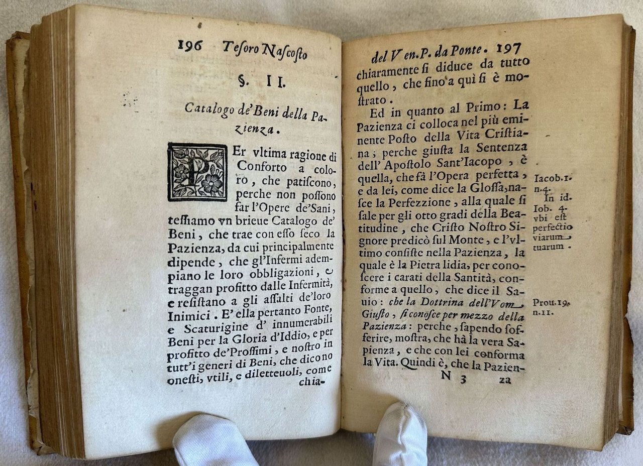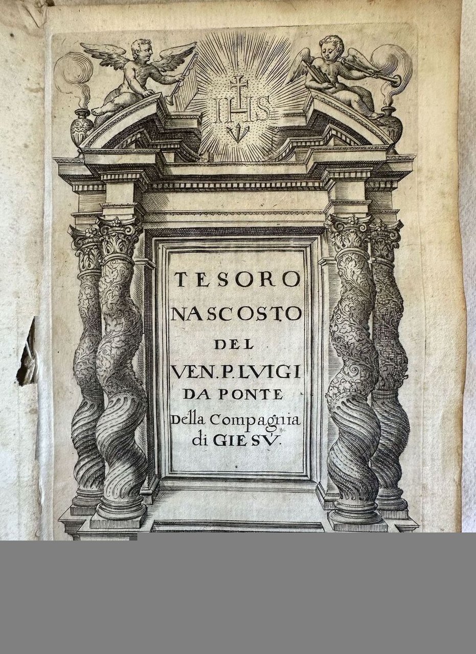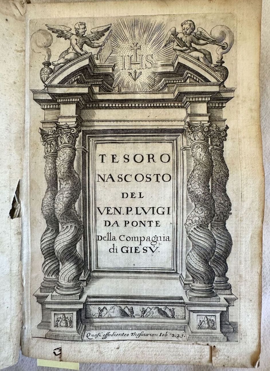 Edizione originale del 1690 di questa opera di ascetica del gesuita spagnolo e scrittore ascetico Luigi Ponte (Luis de la Puente) (1554-1624). L'opera è in un volume ed è completa. Traduzione a cura di Camillo Maria Rinaldi. All'interno: Meditazioni sulla providenza, infermità, malattie, tentazione, Sacramento dell'estrema unzione, buona morte ecc. Frontespizio figurato. Aluni fiori secchi nel volume che tuttavia non hanno provocato macchie nella carta. In buone condizioni. Copertina in piena pergamena coeva con titolo manoscritto al dorso in ottime condizioni generali con lievi usure ai margini e dorso. Legatura in discrete condizioni, corpo del libro in parte staccato. Pagine in buone condizioni con rare fioriture. Piccolo forellino a pag. 119 e 121 con leggera perdita di testo. In 16. cm. 16x11. Pp. XXIX+(1)+375+(1). Original edition of 1690 of this work of ascetic by the jesuit ascetic spanish writer Luigi Ponte (Luis de la Puente) (1554-1624). The work is in one volume and it is complete. Translation by Camillo Maria Rinaldi. Inside: meditations about providence, illness, deseases, temptations, extreme unction, good death ecc. Figurated title page. Some dried flowers in the volume that did not cause any stain in paper. In good conditions. Parchment coeval cover with handwritten title in the spine in very good conditions lightly worn in the extremities. Binding in fair conditions, the body fo the book partially detached. Pages in good conditions with occasional foxing.Little hole in pag. 119 and 121 with light loss of text. In 16. cm. 16x11. Pp. XXIX+(1)+375+(1).