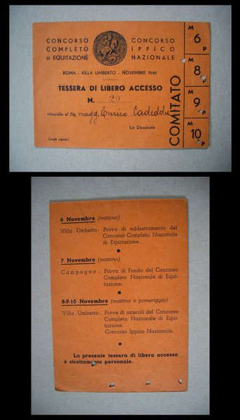 Tessera CONCORSO IPPICO NAZIONALE (Equitazione) ROMA Villa Umberto 1946