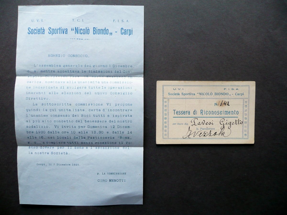 Tessera, Società Sportiva Nicolò Biondo" - Carpi Tessera di Riconoscimento 1920 Con acclusa lettera della suddetta società 1920; tessera di riconoscimento a stampa su cartoncino; sezioni bianche compilate manualmente; cm 7x11. Acclusa lettera dattiloscritta della suddetta società, datata Carpi, 7 dicembre 1920 (vedi foto). Condizioni di conservazione Tessera ben conservata con tracce d'uso, alcune piccole lievi bruniture e aloni. La lettera acclusa è relativa alle elezioni del nuovo Consiglio direttivo, indette per domenica 12 dicembre 1920 presso i locali della pasticceria "Roma". SC03.D11523 N "