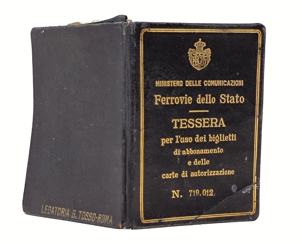 Una tessera in pelle delle Ferrovie dello Stato, di dimensioni 8,5 x 12,5 cm circa, con, al suo interno, una 'Carta di autorizzazione per l'acquisto di biglietti di 2° o 3° classe a metà prezzo per viaggi di corsa semplice di percorso non superiore ai 100 km / categoria B / Valevole tre mesi'.'L'interno della tessera (valevole dal 1927 al 1932) è compilata ed è anche presente fotografia del titolare. Sulla fotografia è presente il bollo a secco delle Ferrovie dello Stato. La carta di autorizzazione è compilata, in tutte le sue parti, a penna ed è datata 1928. Sulla carta è stata incollata la ricevuta d'acquisto. Sul bordo superiore della carta è presente, stampata, l'indicazione 'Torino (Ag. Cassa Naz. Ferr.)'. Anche sull'autorizzazione è presente il bollo a secco delle Ferrovie dello Stato. Stato di conservazione: Ordinari segni del tempo e dell'utilizzo (in particolare si segnala un'orecchia' dell'angolo inferiore della coperta anteriore della tessera) ma, nel complesso, un buon esemplare.