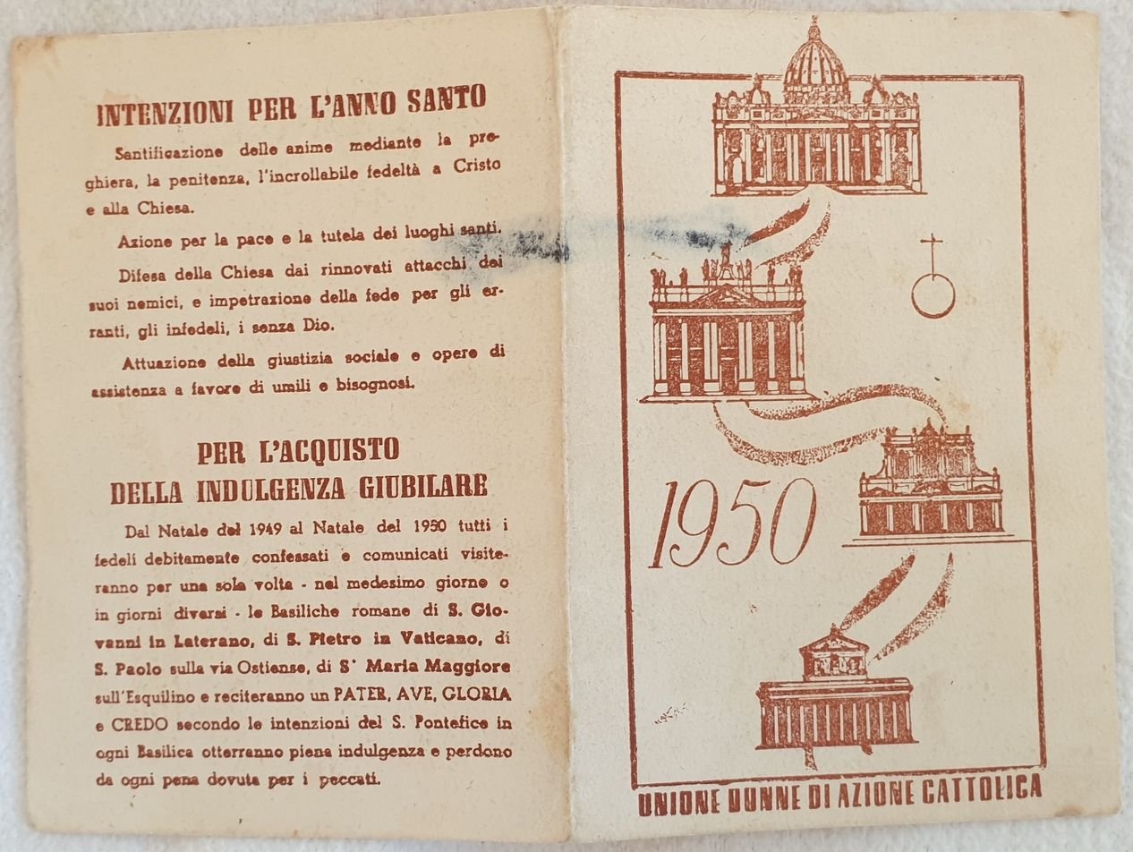 Tessera dell'anno 1950 dell'Unione donne di Azione Cattolica della sezione di Rieti dell'anno 1950. Presente numero di tessera e dati del tesserato. In copertina Intenzioni per l'anno Santo, Per l'acquisto della Indulgenza giubilare. In ottime condizioni. cm 11x7,5Card of 1950 of the Unione donne di Azione Cattolica of the section of Rieti of the year 1950. There is the number of card. In the cover intentions for Holy Year, for jubille intention. In very good conditions. cm 11x7,5