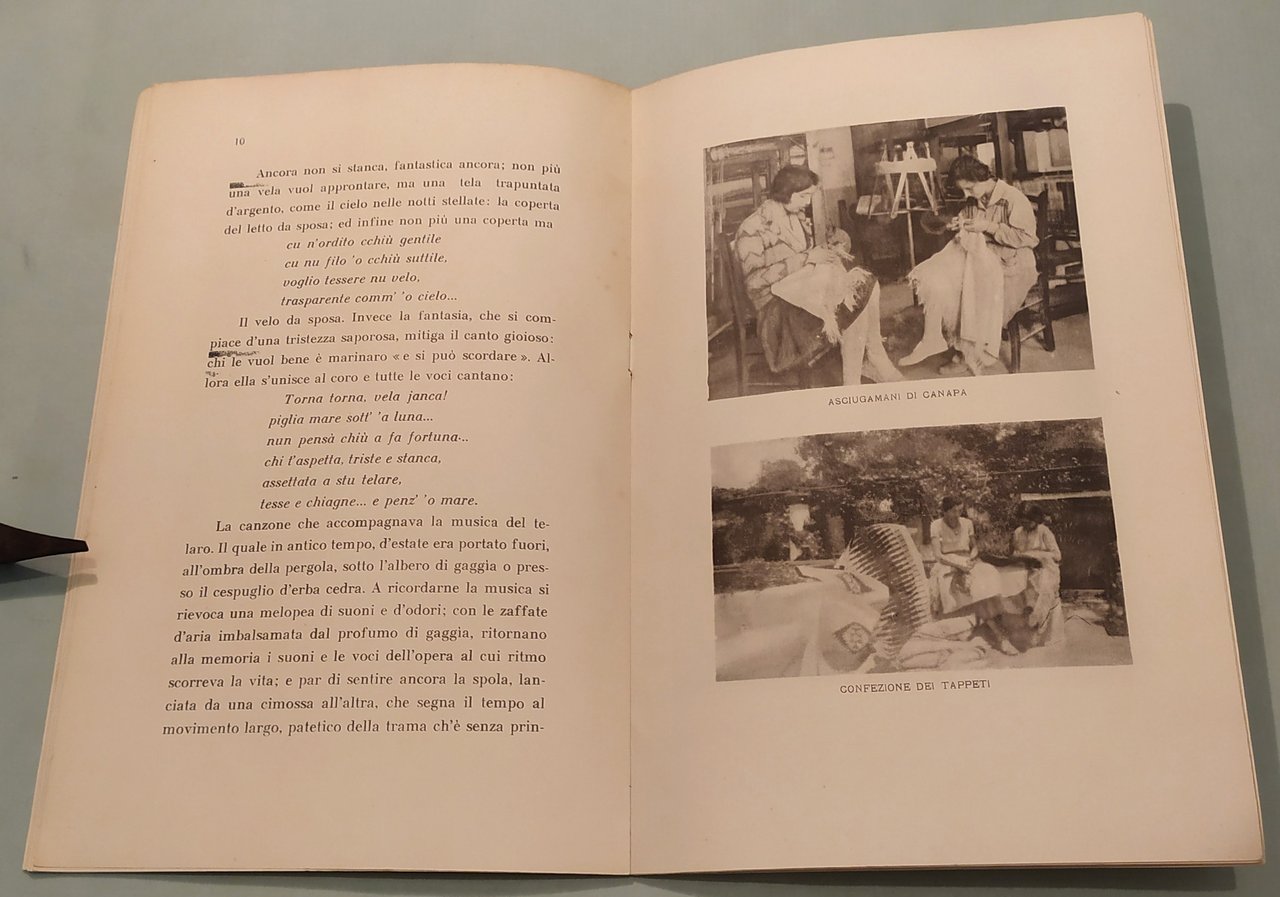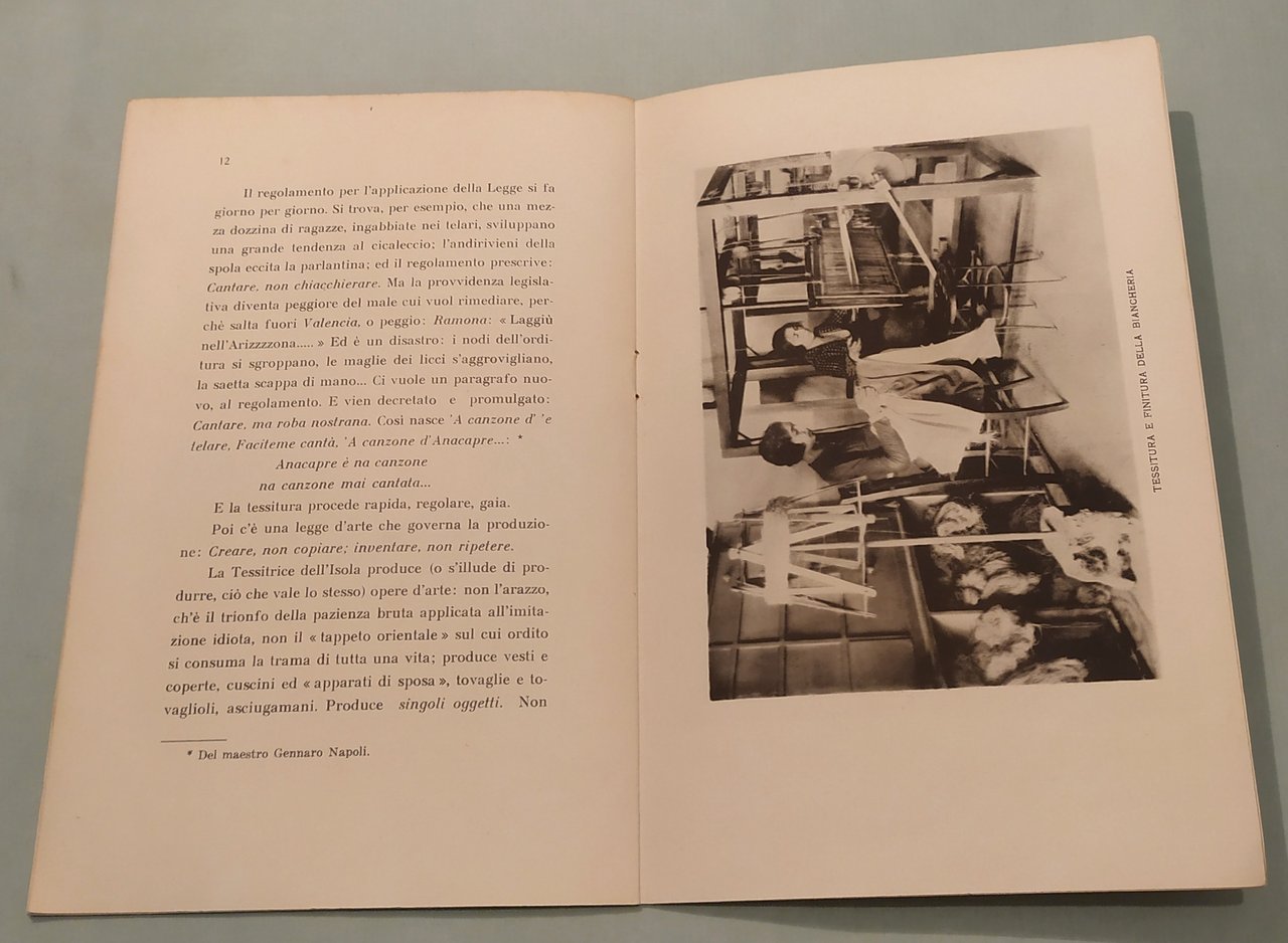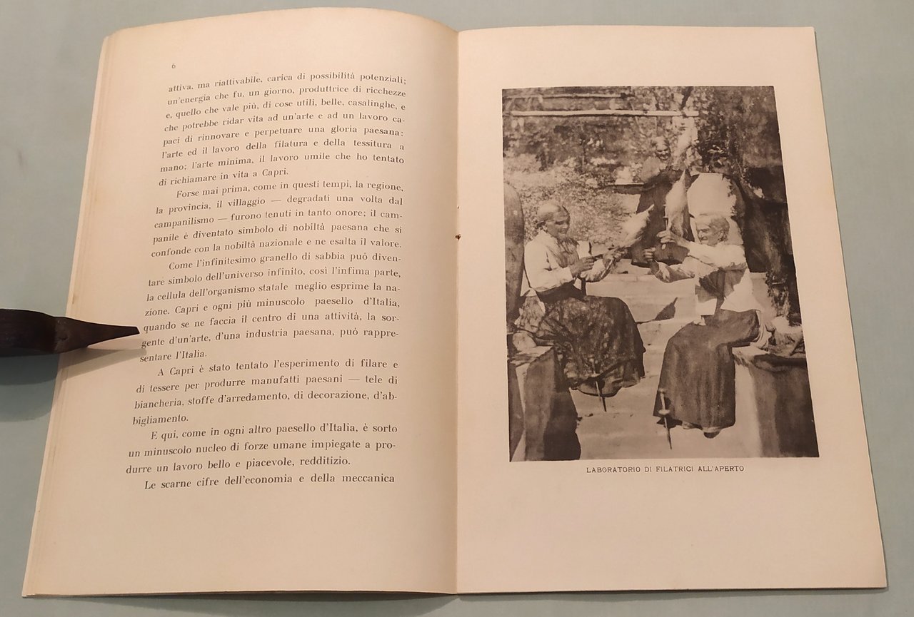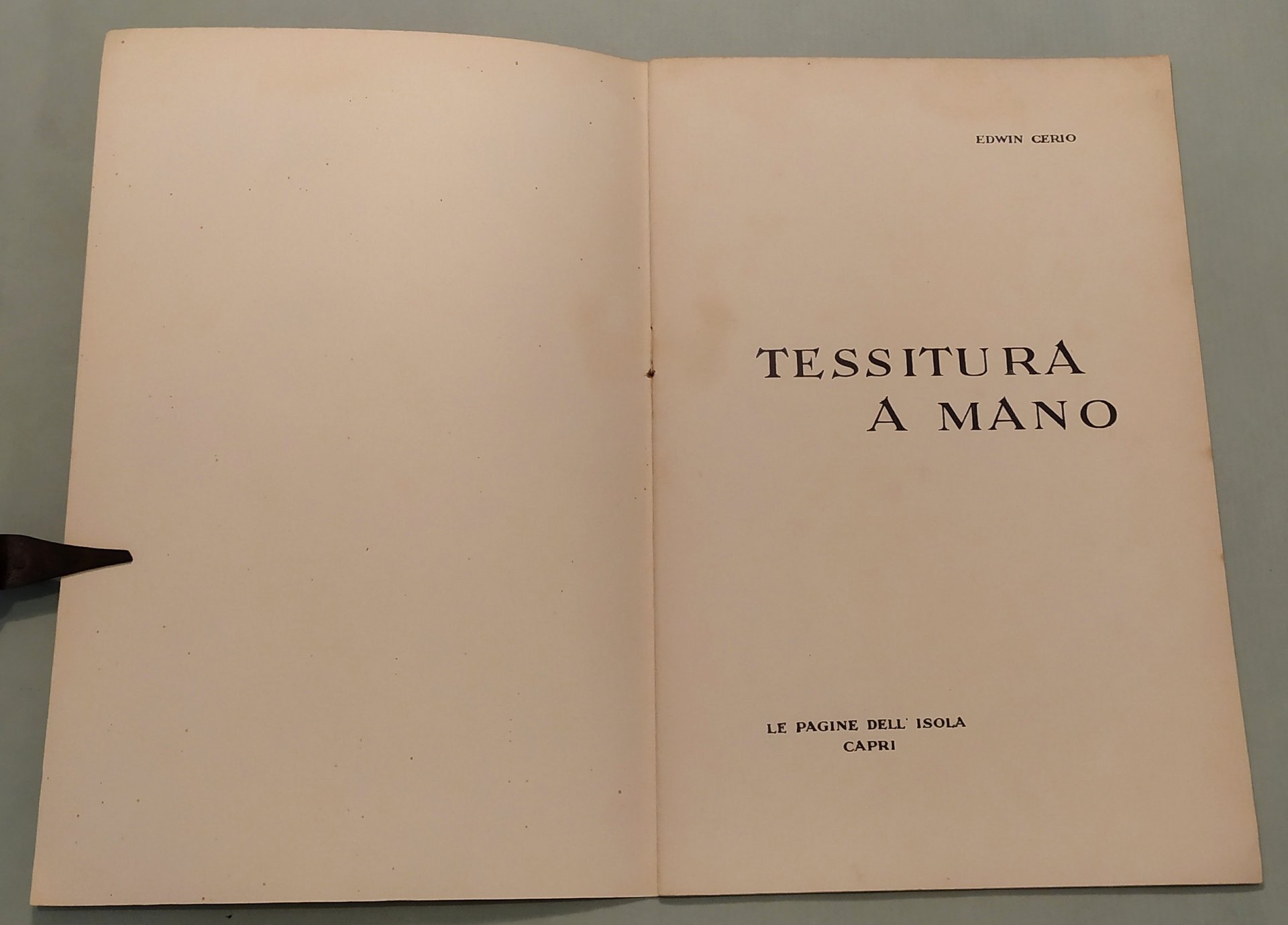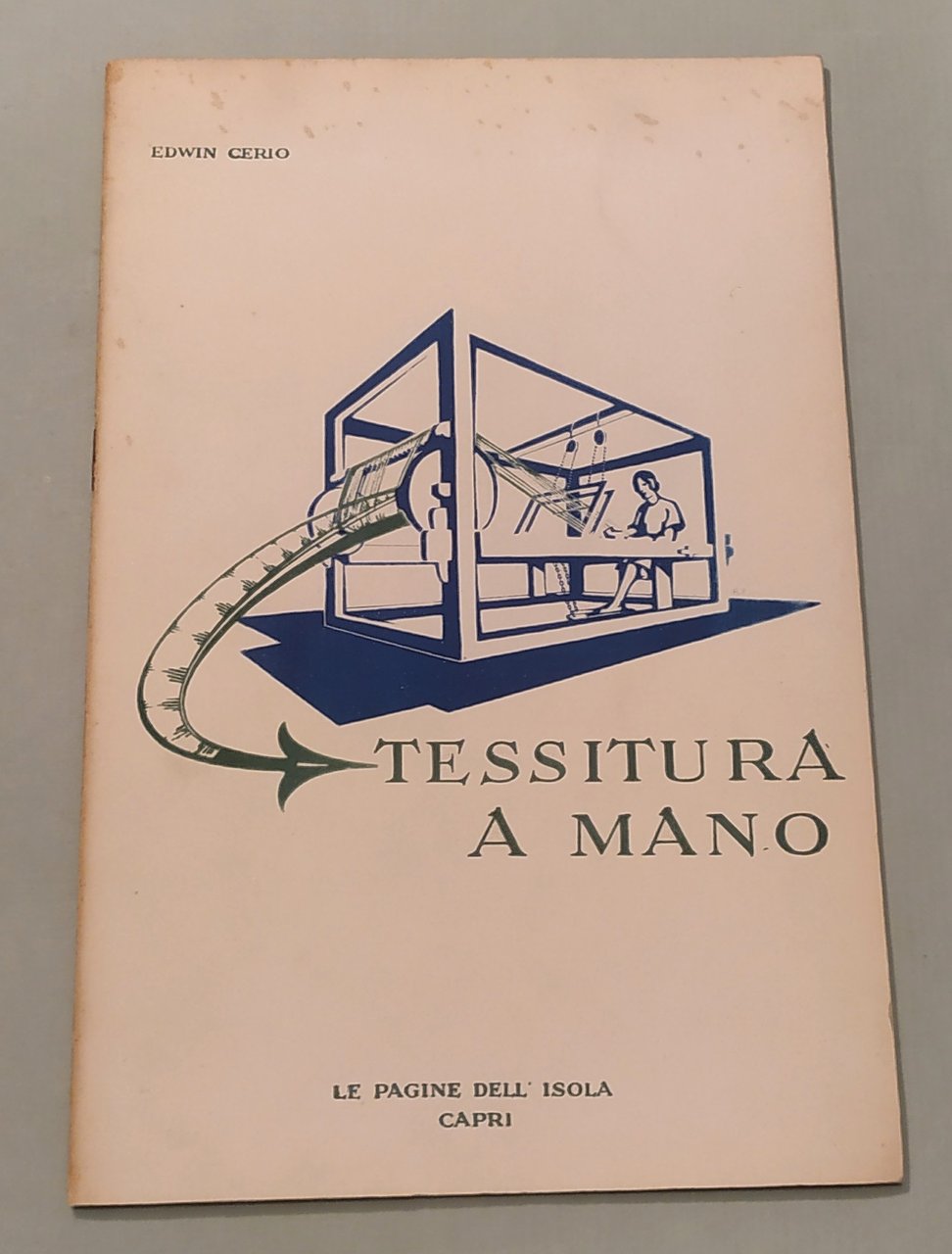 CERIO Edwin. Tessitura a Mano. Capri, Le Pagine dell’Isola, (1930). In 8vo; pp.16 e 10 foto di antichi telai e artigiani. Cop.edit. illustrata. Sandomenico, pag.114: “Un testo poetico-filosofico su la “Tessitrice dell’Isola” un’azienda senza statuto e senza atto costitutivo, con la finalità di creare lavoro casalingo. Cerio auspica la presenza di un telaio in ogni casa, così da battere “l’ozio generatore di vizi”.