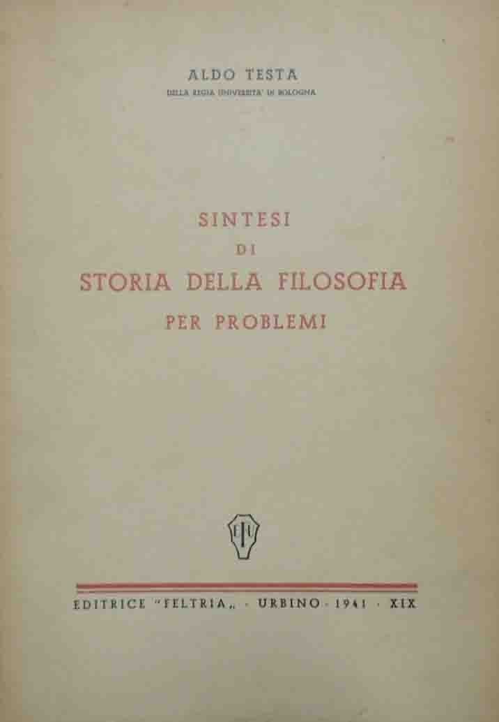 Aldo Testa, Sintesi di storia della filosofia per problemi, Editrice Feltria, Urbino 1941, pp. 274, cm 26, br. ed. Tracce d’uso, qualche strappetto e piccola mancanza ai margini della brossura, alcune sottolineatura a pastello, leggera brunitura della carta, ma nel complesso copia ancora in condizioni accettabili.