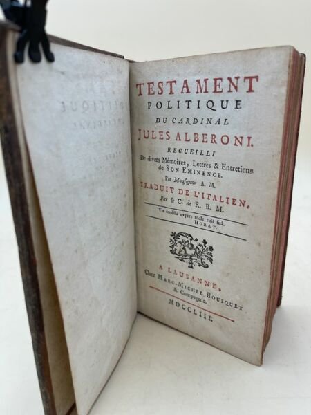 chez Marc Michel Bousquet 1753 A Lausanne, chez Marc Michel Bousquet, 1753. In-12 relié plein veau de l'époque, dos à nerfs orné, pièce de titre, tranches rouge. 1 feuillet blanc, titre, XXX + 450 pages + 1 feuillets blanc. Traduit de l'italien par le C. R.B.M. Edition originale de ce testament apocryphe du Cardinal Giulio Alberoni (1664-1752). Ouvrage attribué à Maubert de Gouvest parfois à Joseph-Marie Durey de Morsan : Querard Supercheries littéraires. Accroc sans manque au bas du dos, reliure légèrement épidermée, intérieur frais.