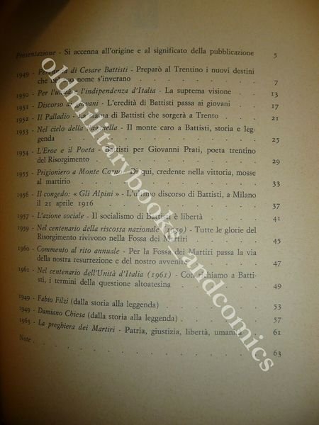 TITOLO: TESTIMONIANZE DI UN VOLONTARIO TRENTINO DELLA GUERRA DI REDENZIONE NEL 50 ANNIVERSARIO DEL MARTIRIO DI CESARE BATTISTI, DAMIANO CHIESA, FABIO FILZI DESCRIZIONE: Auspice l'Associazione nazionale volontari di guerra Trento 1966, br. ed. con alette, pp. 64 in 8°. CONDIZIONI: Ottime/Perfette. PESO / WEIGHT: 200 gr. without package