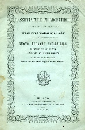 In-8°, pp. 32, brossura editoriale azzurrina con titolo e vignetta entro bordura ornamentale. Insistenti aloni alle ultime pp. e alla brossura posteriore. Esemplare da studio. Prima edizione italiana. La brossura anteriore presenta un diverso titolo: 'Rassettature impercettibili senza filo, seta, lana, cotone, ecc. Colla sola opera d'un ago. Nuovo trovato infallibile insegnato in cinque lezioni facilissimo ad apprendersi anche da chi non sappia punto cucire'. Una sola copia in SBN / ICCU.