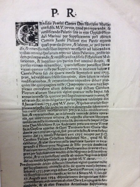 In-4 gr. (mm. 338x218), plaquette di 4 cc.nn. contenuta in cartellina mod., note a penna di mano antica alle cc. 3-4, testo in latino. Interessante documento riguardante i beni di tre grandi famiglie milanesi (Arcimboldi, Lampugnani, Marliani); il restauro di palazzo Marliani a Mariano e la causa giudiziaria intentata dal conte Ercole Marliani ad una della più famose opere assistenziali di Milano, l'Ospizio della Stella.Il conte Ercole, prelato (morto nel 1757), fu l'ultimo del ramo dei Marliani feudatari di Mariano. L'Ospizio della Stella (dapprima chiamato dei mendicanti) fu fondato nel 1578 da San Carlo Borromeo nell'antico monastero della Stella, attiguo alla chiesa di S. Maria della Stella, a Porta Vercellina. Vi furono accolti uomini, donne, fanciulli che la peste del 1576 aveva ridotto in povertà, malati cronici, vecchi paralitici. Si ingrandì rapidamente (arrivò ad accogliere 3.000 ricoverati), godette di privilegi ed esenzioni, di lasciti e donativi. I poveri vi imparavano un mestiere per poi entrare a pieno titolo nella società. All'inizio del 600 per volontà del Cardinale Federigo Borromeo fu costruito l'attuale vasto palazzo. L'Ospizio si trasformò successivamente in un orfanatrofio maschile e femminile, divenuto poi dal 1788 solo femminile e perciò chiamato delle Stelline.Esemplare ben conservato.