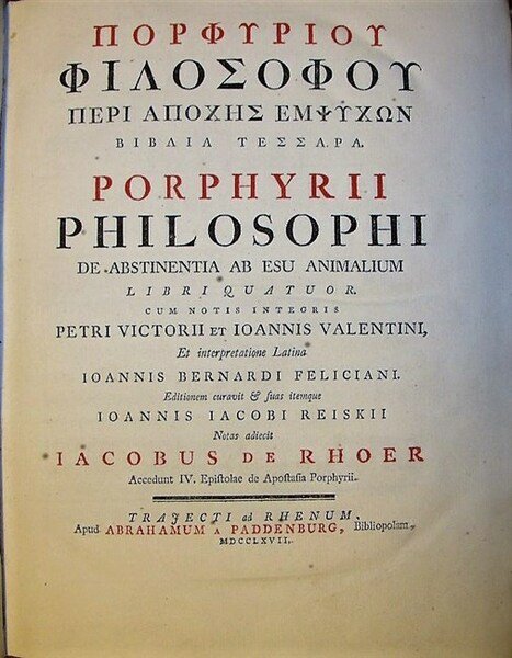 [testo greco] DE ABSTINENTIA AB ESU ANIMALIUM Libri quatuor. Cum notis integris Petri Victorii et Ioannis Valentini et interpretatione Latina Ioannis Bernardi Feliciani. Editionem curavit & suas itemque Ioannis Iacobi Reiskii Notas adiecit Iacobus de Rhoer. Accedunt IV Epistolae de Apostasia Porphyrii.