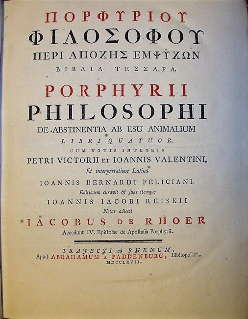 in-4, pp. (36), 398, (14), bella leg. p. perg. coeva, tagli spruzzati. Front. a due colori. Testo greco e latino, su due colonne. Opera molto rara, uno dei primissimi studi sui precetti vegani del filosofo allievo e biografo di Plotino. Si suddivide in quattro parti. Nella prima, rivolgendosi a Fermo Castricio, filosofo pitagorico, l'A. lo accusa di essere ritornato ad una dieta a base di carni, abbandonando il vegetarianesimo e commettendo così un'zione illegale ed empia. Nella second aparte sono esposte le ragioni di Stoici, Peripatetici ed Epicurei sull'argomento, in particolare sul diritto di uccidere esseri viventi. Nella terza sono esposte ed enucleate alcune proposte peculiari di Porfirio sulla materia: anzitutto il consumo di carni e sacrificio di animali è una forma di cannibalismo essendoci continuità tra uomo e animale. Infine sono riportati esempi di astinenza e continenza tra gli Spartani, Egizi Ebrei e Greci. Belliss. esempl. in ottimo stato di conservaz. [049]