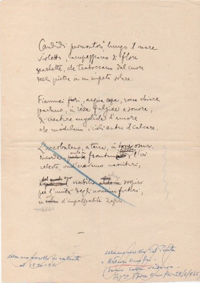 AUTOGRAFOSi tratta della stesura originale di una poesia probabilmente risalente (come si evince da un appunto a penna) al 1920-21. Incipit: “Candidi promontori, lungo il mare / violetto, campeggiano di flore / scarlatte, che traboccano dal cuore / della pietra in un impeto di dolore [.]”. In fondo al foglio in basso a destra si trova un appunto manoscritto: “Dono della vedova Signora Bice Onofri. 28/1/1966”.