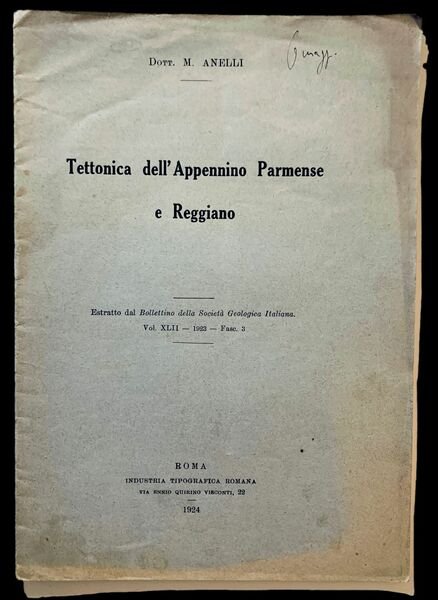 In 4°; (3), 378-398 pp. Brossura editoriale con titolo impresso in nero al piatto anteriore. Prima edizione in forma singola, di quest'articolo di interesse geologico legato all'Appennino parmense e reggiano, apparso lo stesso anno sul Bollettino della Società Geologica Italiana. In ottime condizioni di conservazione.