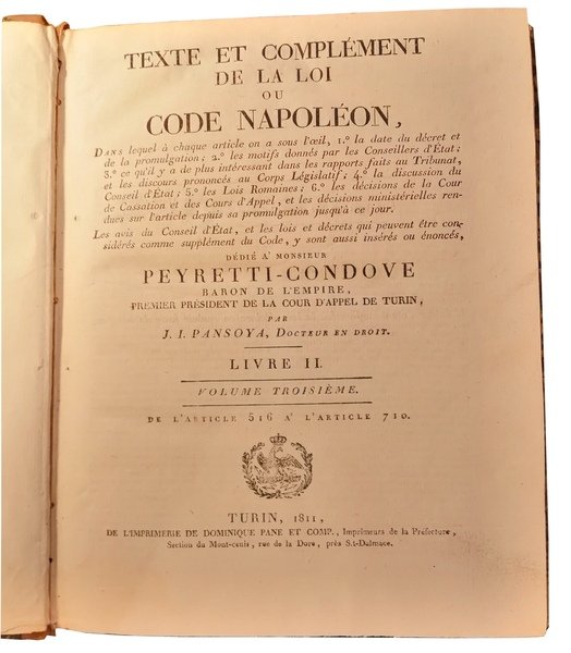 Texte et complement de la loi ou Code Napoleon dans lequel à chaque article.dedie a Monsieur Peyretti - Condove.par J. I. Pansoya Livre II Volume troisieme de l'artyicle 516 a l'article 710