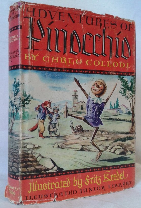 Volume in 8, tela editoriale figurata, titolo al dorso figurato, sguardie illustrate a colori, con una magnifica carrellata di tuti i personaggi del racconto, bianca, occhiello, antiporta a colori, frontespizio, VIII, 257 pp., carta di pubblicit editoriale, 10 tavole f.t. a colori, molte illustrazioni n.t. in bianco e nero. Il burattino pi noto e pi amato nella sua eterna avventura in un'edizione ricca d'icomografia di grande qualit. Prima edizione illustrata dal bravissimo Kredel, rara a trovarsi completa di tutte le dieci tavole (in molti esemplari ne sono presenti meno). Completo della sovracoperta illustrata, quasi perfetta. In ottimo stato, assai poco comune
