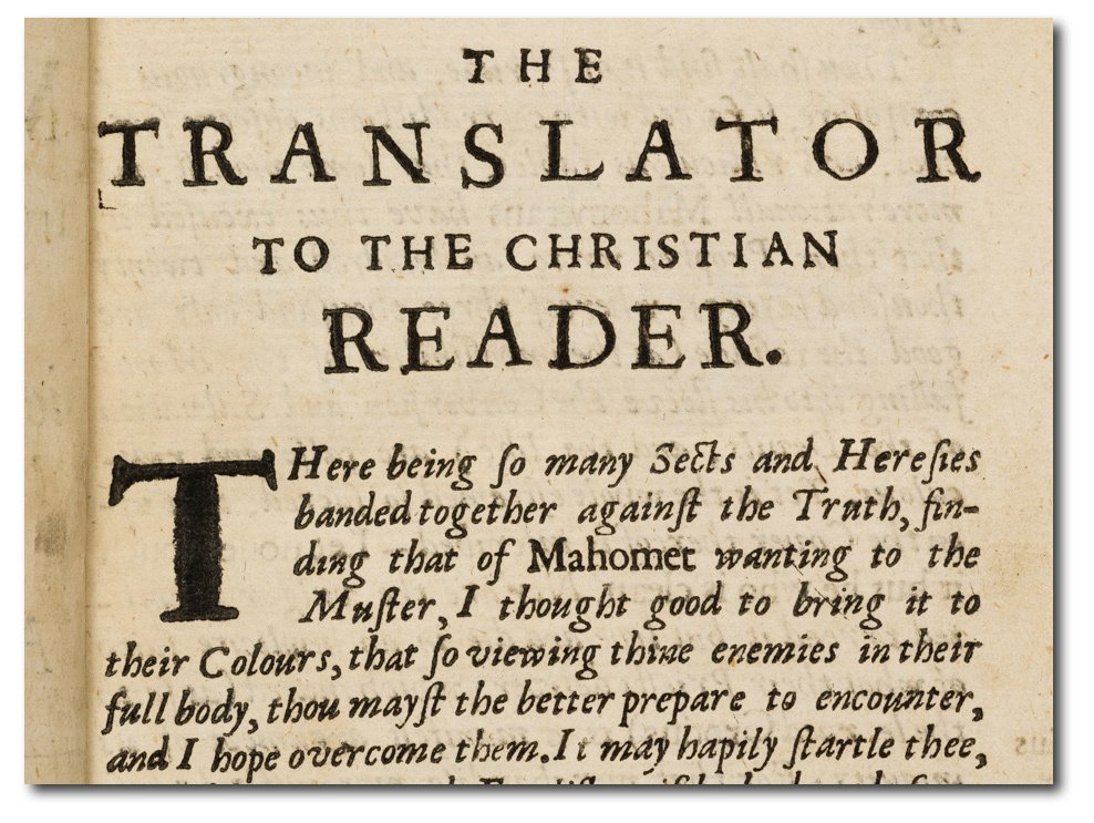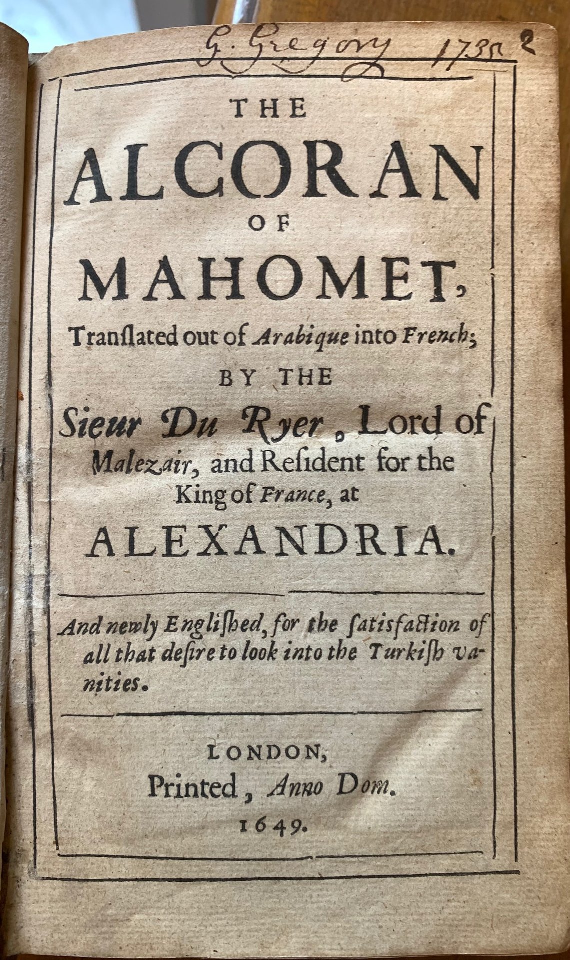Andrew du Ryer (1580-1660) fu celebre orientalista e diplomatico, prima a Costantinopoli e poi ad Alessandria, dove fu console. Fu interprete di Luigi XIII e pubblicò alcune traduzioni da opere orientali e la prima traduzione integrale del Corano in una lingua viva - essendo le precedenti in Latino - "for the satisfaction of all that desire to look into the Turkish vanities" (dal titolo). Il libro fu interdetto dal Council of Conscience su insistenza di San Vincenzo de' Paoli. Edizione rara e di grande importanza per l'introduzione dell'Islamismo in Gran Bretagna. Buon esemplare, malgrado alone d'umido sugli ultimi 10 fogli. Ex-libris William J. Connery, al titolo firma G.Gregory 1735.