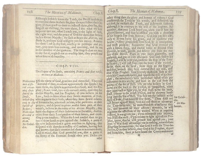 >In-8 (160x120), pp. (20), 405, (15); leg. antica piena pelle. Antica firma di possesso ms, G. Gregory, 1735 , nel margine superiore del foglio di titolo; ex libris, William Joseph Connery, al contropiatto superiore. Prima edizione in ottavo della prima traduzione inglese del Corano, uscita in contemporanea all'edizione in quarto. Fu redatta da Andrew du Ryer nel 1647 sulla traduzione francese. Comprende: The translator to the Christian; The French Epistle to the Reader; A Summary of the Religion of the Turks…and the whole text of the Qur'an in English. Completa dell'ultimo capitolo spesso mancante: "A needfull caveat or admonition for them who desire to know what use may be made of, or if there be danger in reading the Alcoran".