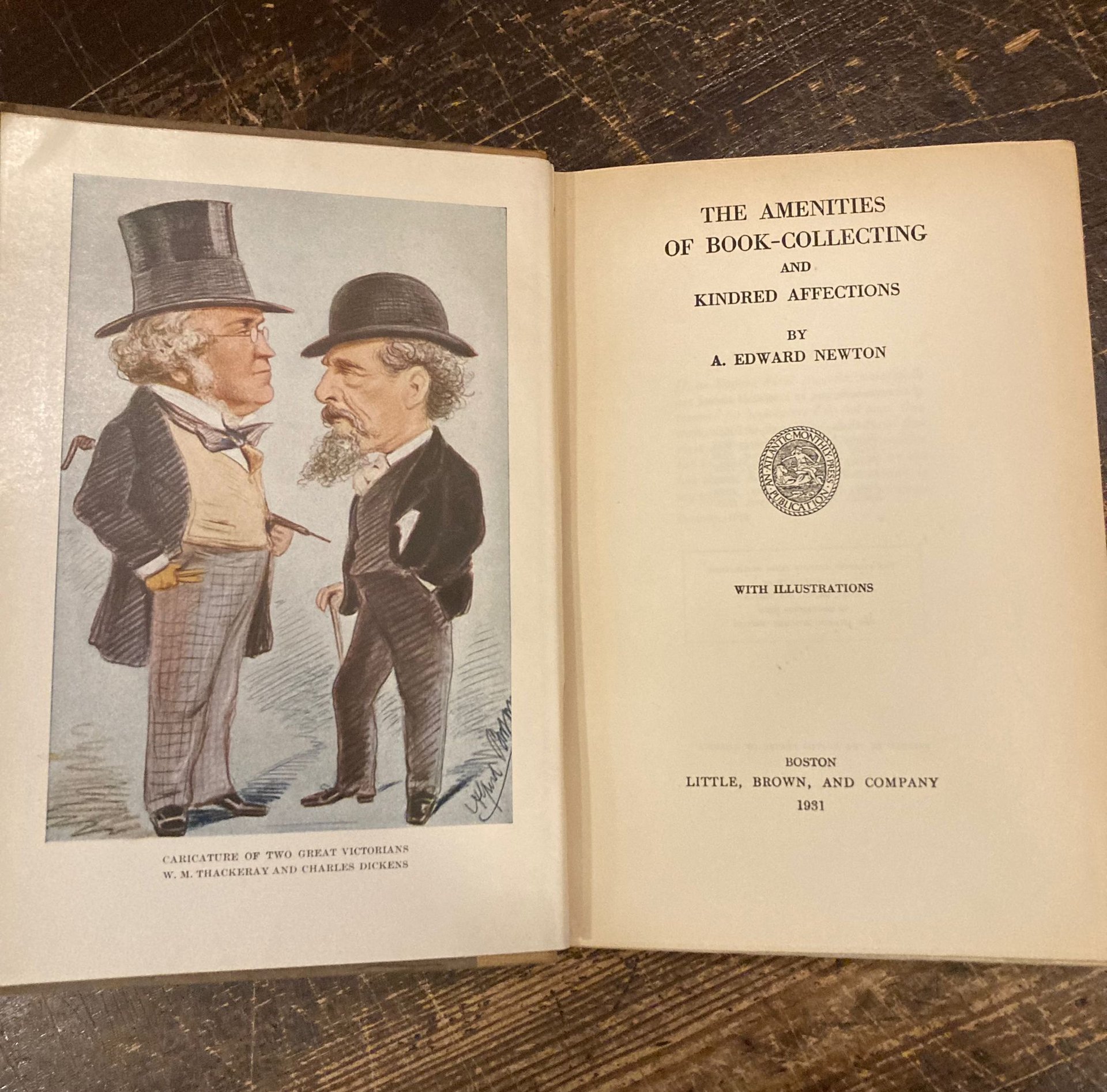 In-8°, pp. XXVII, 372, legatura editoriale m. tela con titolo a stampa su tassello cartaceo al dorso. Antiporta illustrata a colori con una caricatura vittoriana di Thackeray e di Dickens. Numerosissime illustrazioni in b.n. n.t. e f.t. Raccolta di saggi sul collezionismo librario e la bibliofilia. Gli scritti riguardano fra l'altro i cataloghi di libri antichi ed esauriti, le prime edizioni e gli 'associations books', Charles Lamb, James Boswell e Samuel Johnson, William Godwin, Anthony Trollope, il Temple Bar di Londra, Oscar Wilde. Il Newton (Philadelphia, 1863-ivi, 1940) fu uno die maggiori conoscitori e collezionisti di libri antichi della prima metà del '900, autore di alcuni referenziali volumi in materia.