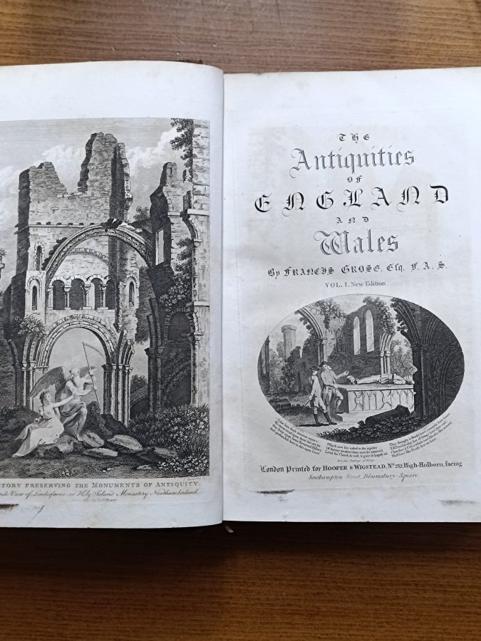 <span style="font-style: normal;"><span style="font-style: normal;">8 volumi in-8° (cm. 26,4), legature coeve in piena pelle nocciola, dorsi lisci con titoli, filetti e stemmi reali in oro (alcune usure ai voll. I-II-III e cerniere deboli), piatti inquadrati da doppi filetti in oro, risguardi marmorizzati; carte in ottimo stato; con 633 bellissime tavole in rame fuori testo (incluse le tavole in antiporta a ciascun volume), 1 grande carta geografica al vol. VII più volte ripiegata fuori testo, 55 mappe nel testo e 8 vignette incise sempre in rame al frontespizio di ciascun volume; sporadiche fioriture. Opera dal ricco apparato iconografico che illustra le antichità dell'Inghilterra e del Galles, tra cui numerose chiese, castelli, monumenti, interni. Grose, importante antiquario londinese, intraprese </span><span style="font-size: 13.333333px;">grazie al suo talento nel disegno </span><span style="font-style: normal;">quest'opera, che </span><span style="font-style: normal;">inizialmente fu pubblicata col titolo </span><i>Views of Antiquities in England and Wales </i>(1773). </span><i>Ex libris</i> figurato applicato al contropiatto di ogni volume. Esemplare molto buono. (SC6)