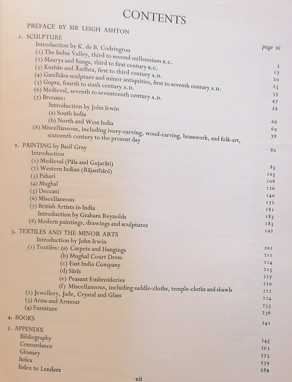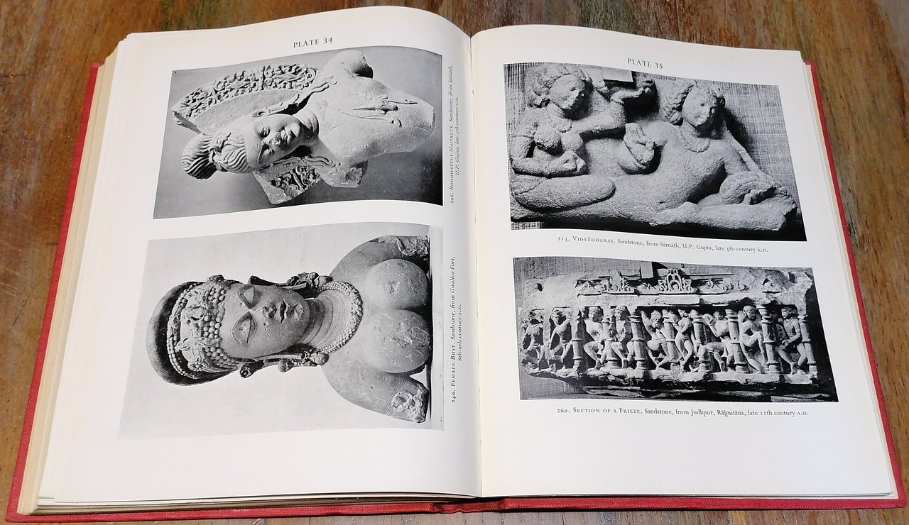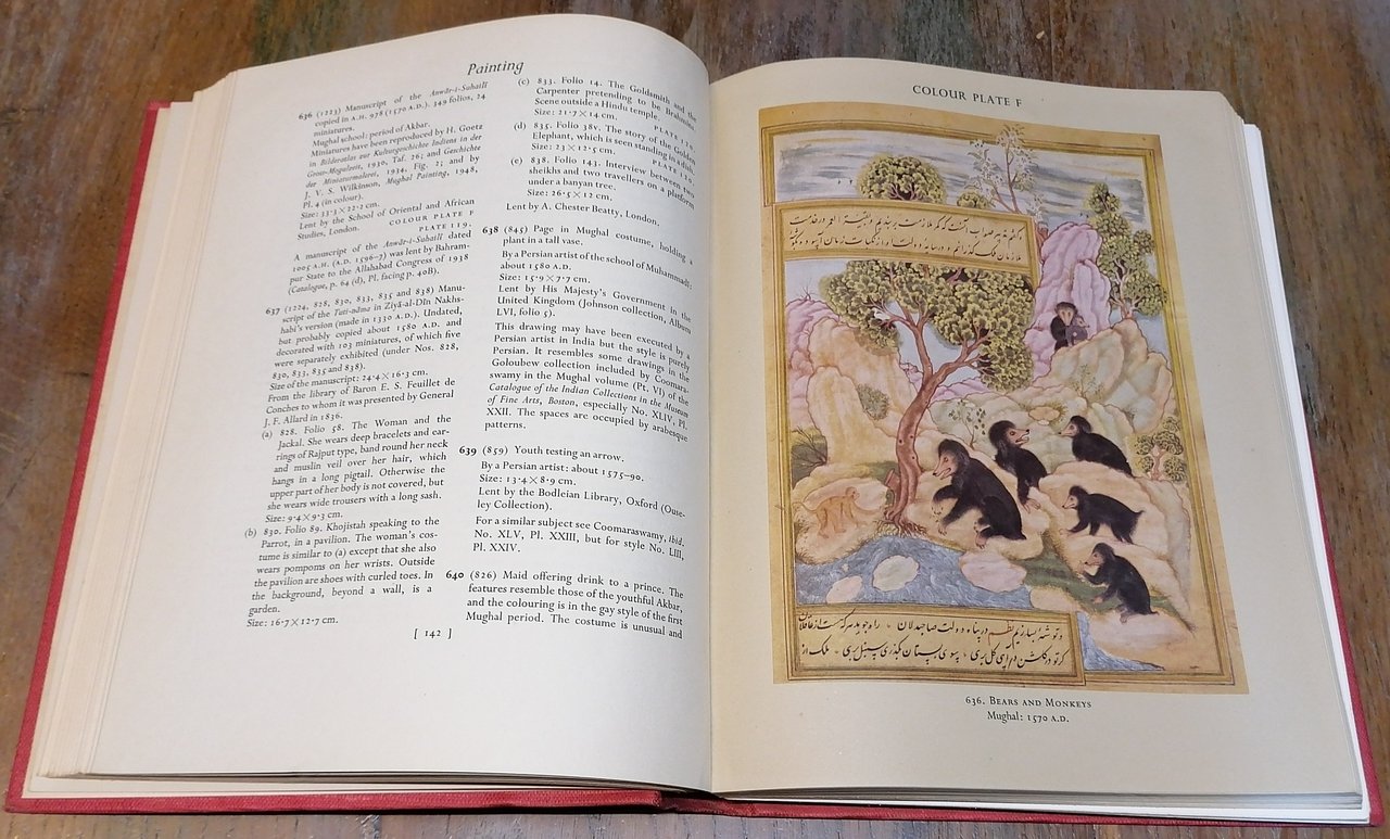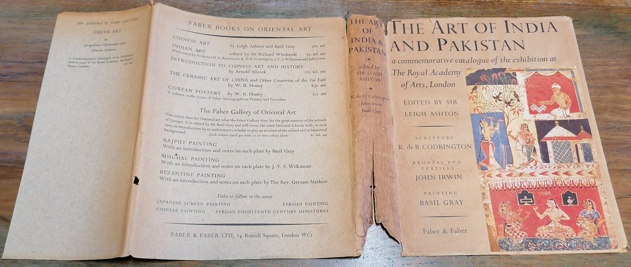 (Arte asiatica - Archeologia - India - Pakistan - Orientalistica) In 8° grande (cm 28 x 22,5), legatura editoriale in piena tela rossa con titoli dorati al dorso e disegno impresso in oro al piatto anteriore, taglio di testa dorato, sovraccoperta illustrata a colori, pp. XI,(1),291,(1), con 8 illustrazioni a colori applicate su tavole fuori testo, 276 figure in bianco e nero su 152 tavole fuori testo. Catalogo dell'importante mostra tenuta alla Royal Academy di Londra nell'inverno del 1947/48, contributi di Basil Gray (pittura), John Irwin ( tappeti, arte tessile, bronzi, arti minori), Kenneth de Burgh Codrington (scultura), Graham Reynolds (pittori inglesi in India). Sovraccoperta con strappi e mancanze, peraltro il volume è in ottimo stato di conservazione.