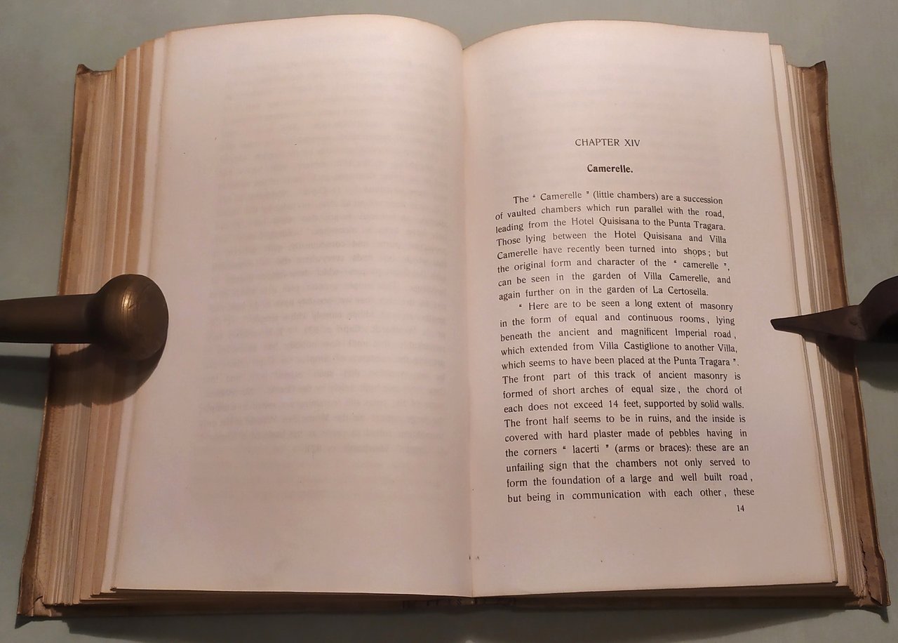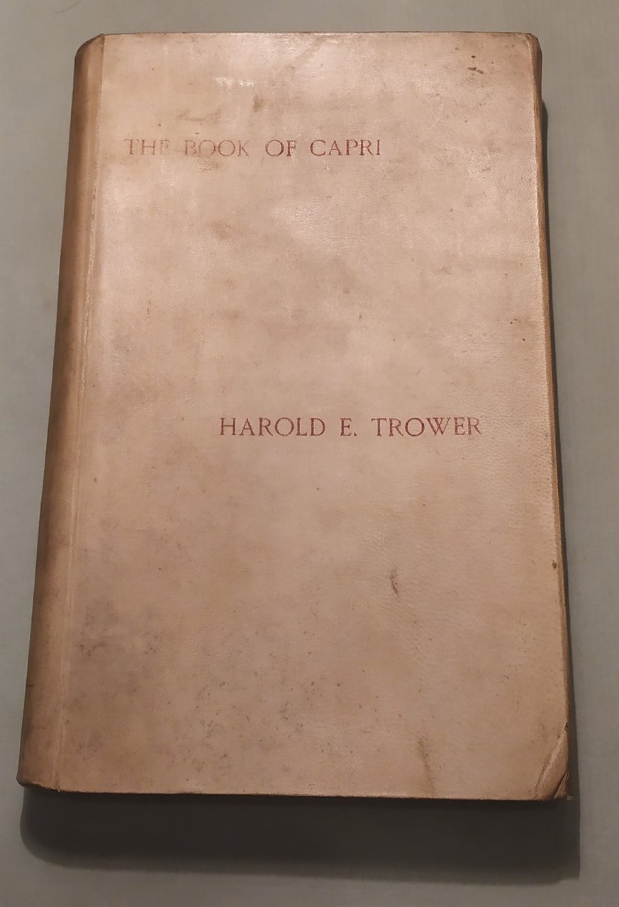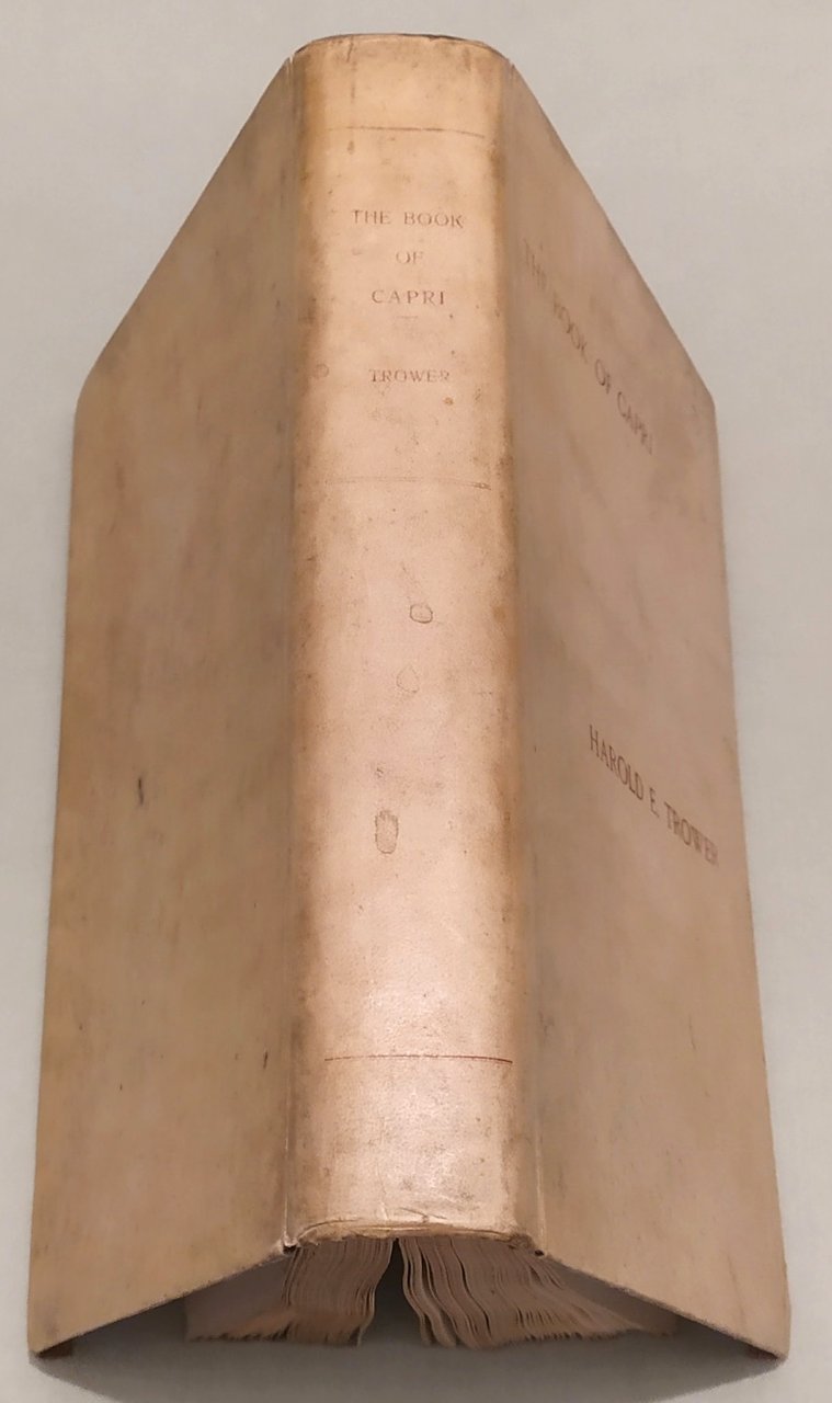 Naples, Emil Prass, 1906. In 8vo; pp.XXVIII, 345. Illustrazioni in seppia a piena pagina. Pergamena con unghie, titolo in rosso al piatto anteriore ed al dorso. Dettagliato studio dell'isola: storia, topografia, geologia, le ville e i luoghi più suggestivi, la flora e la fauna, le feste ed il carnevale. Un'attenta bibliografia. Un capitolo dedicato all'occupazione francese ed inglese. Trower, famoso avvocato, fu nominato agente del consolato inglese a Capri. Divenne amico di Norman Douglas che lo caratterizzò come Freddy Parker in "South Wind". Edizione originale assai rara. Furcheim, pag. 25; Doria, 527 bis.
