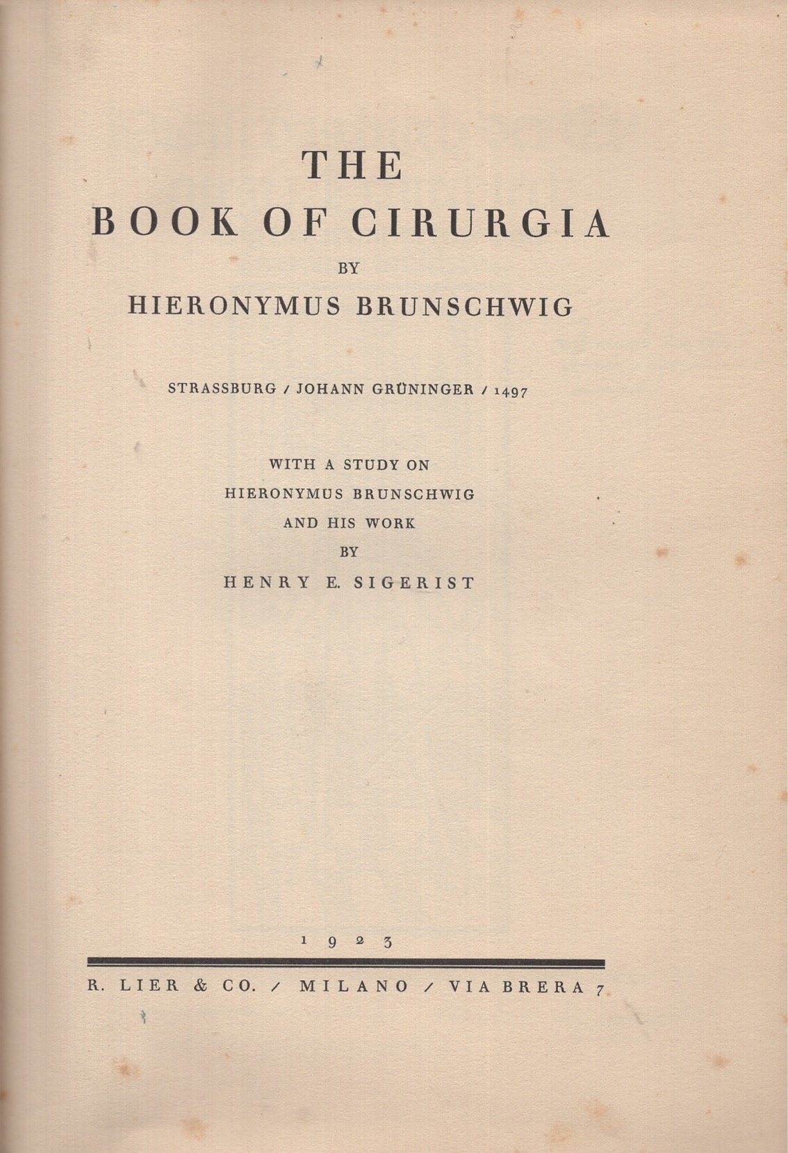 Anastatica del trattato pubblicato na Strasburgo da Johann Grüninger nel 1497. Con uno studi su Heronimus Brunschwig a la sua opera di Henry Sigerist, pp I-XVI