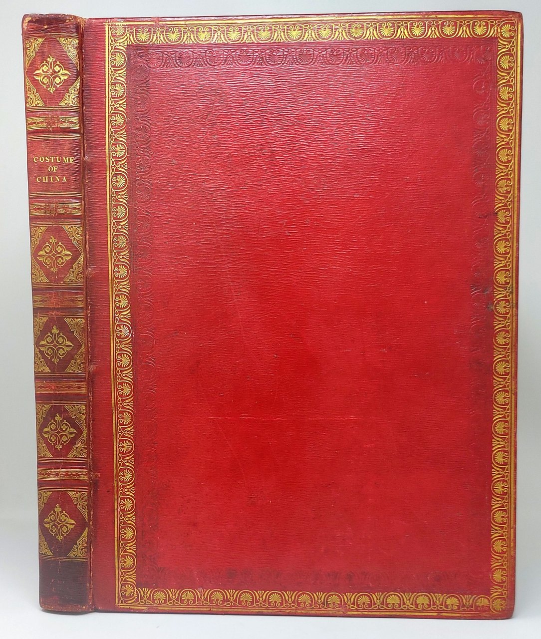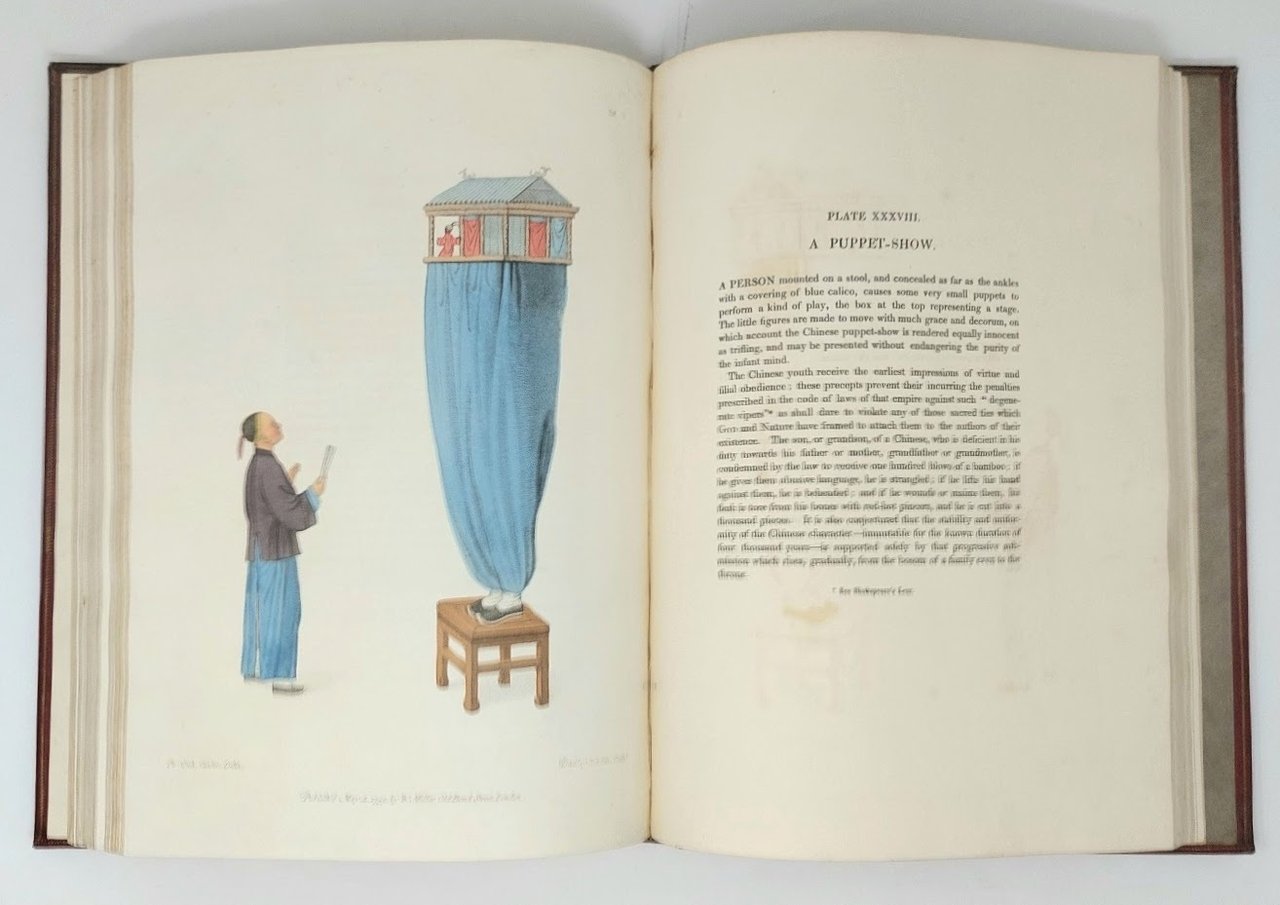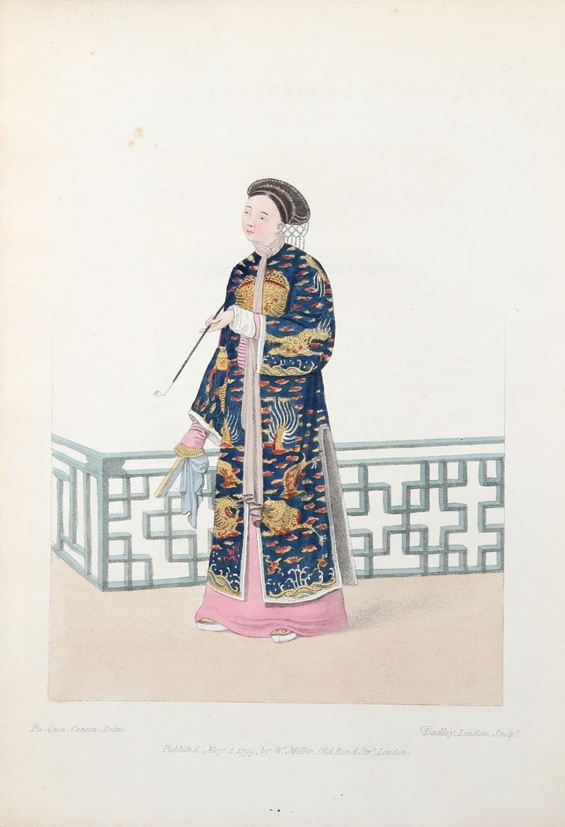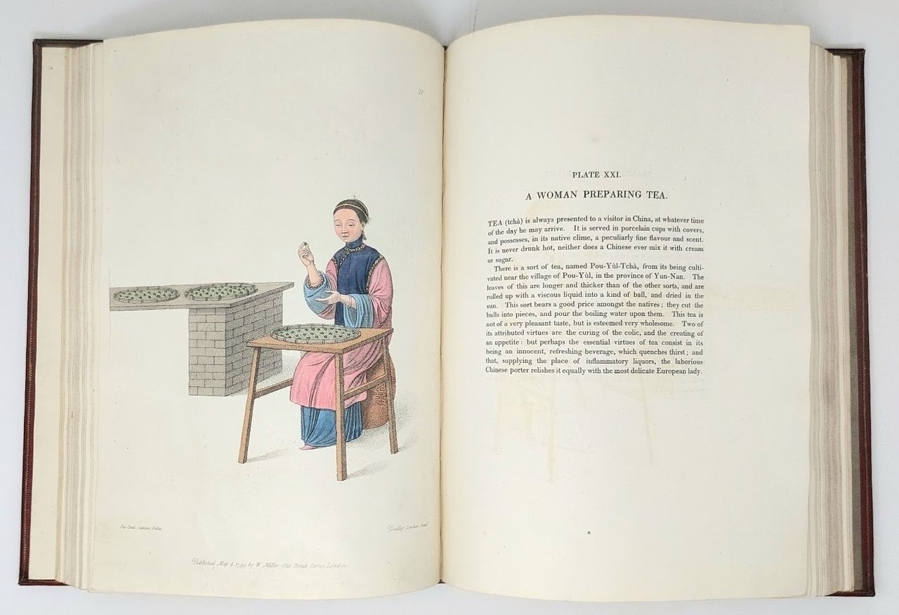 >Folio (353 x 248 mm). (8) carte (di cui 2 con il catalogo dell'editore, sommario e 2 prefazioni) e 60 litografie a piena pagina, colorate, tratte dai disegni del Pu-Qua cantonese. Ogni tavola è corredata dal foglio esplicativo in inglese e francese. Legatura coeva in marocchino rosso a grana lunga, ricchi fregi e al dorso, tagli dorati (angoli e cuffie usurati, alcuni graffi, cerniere deboli). Filigrana datate 1821-1823. Qualche lieve brunitura e piccole macchie, ma ottimo esemplare. Prima edizione di questo lussuoso lavoro sui costumi cinesi, che rappresentano per lo più operai e artigiani, come il libraio, il pittore di lanterne, il cacciatore di rane, il cesto, il ricamatore. Solo un mandarino e una donna distinta rappresentano la classe superiore. Il lavoro faceva parte di una serie di 11 libri su "I costumi di vari paesi" pubblicati da Miller e dal 1822 distribuiti da Mac Lean. “Le incisioni di The Costume raffigurano singoli cinesi nell'abito adatto alla loro occupazione o grado e sono basati su originali dell'artista cantonese di esportazione Pu-Qua e incisi da J. Dadley. Questa è l'edizione ampliata con 60 piatti. Le versioni successive avevano solo 48 ” (Western Travelers in China, 49). Ottimo esemplare.