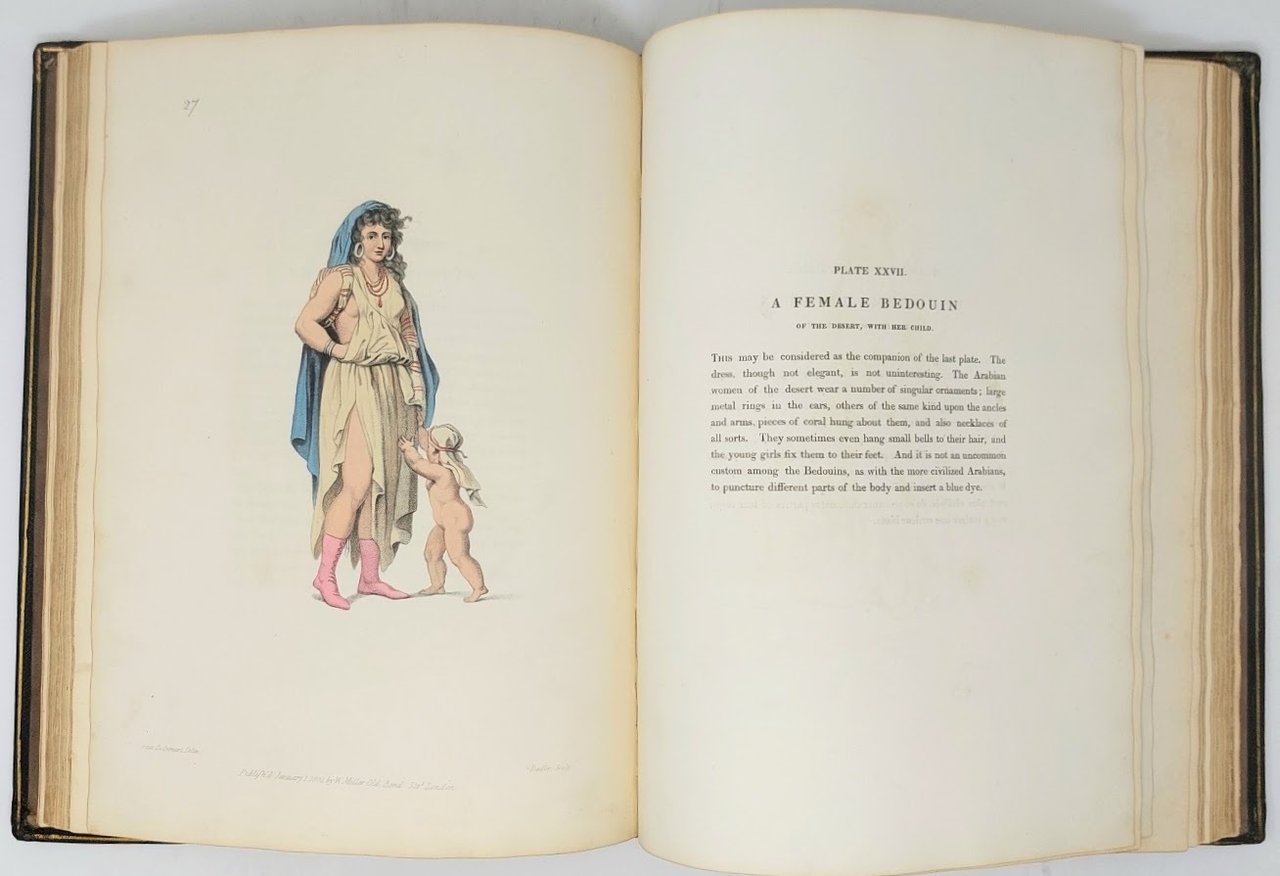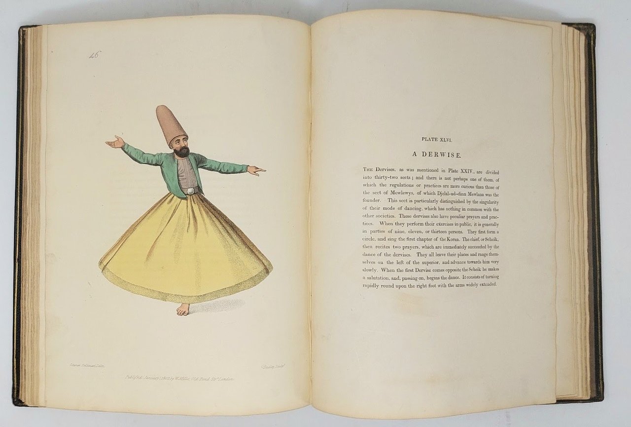 >in-folio (360 x 270 mm.), ff. 6 n.n., con titolo, prefazione e indice, 60 ff. di testo descrittivo in lingua inglese e francese, bella legatura del tempo in pieno marocchino blu decorata in oro ed a secco sui piatti e al dorso, tagli dorati. Una incisione a colori al titolo e 60 tavole incise in rame e dipinte in origine a mano (firmate Octavien Dalvimart delin. - Dadley sculp.) . Le tavole, assai belle, raffigurano a figura intera uno o due personaggi, maschili e femminili, in abbigliamento tipico della propria classe sociale o professione. Importante rassegna e documentazione degli abitanti della Turchia sul finire del XVIII secolo. ''The Drawings, from which ... [the] plates have been engraved, were made on the spot ... by Monsieur Dalvimart, and may be depended upon for their correctness. They have been accurately attended to in the progress of the engraving; and each impression has been carefully coloured according to the original drawing, that the fidelity of them might not be impaired'' (Preface). Esemplare a grandi margini in splendida legatura (la prima tavola ''The Kislar Aga'', rifilata e da altro esempl. con timbro della Brooklyn Public Library). Colas I, 1782. Vinet, n.2337. Lipperheide, n.1482. Abbey Travel II,370. Atabey 313.