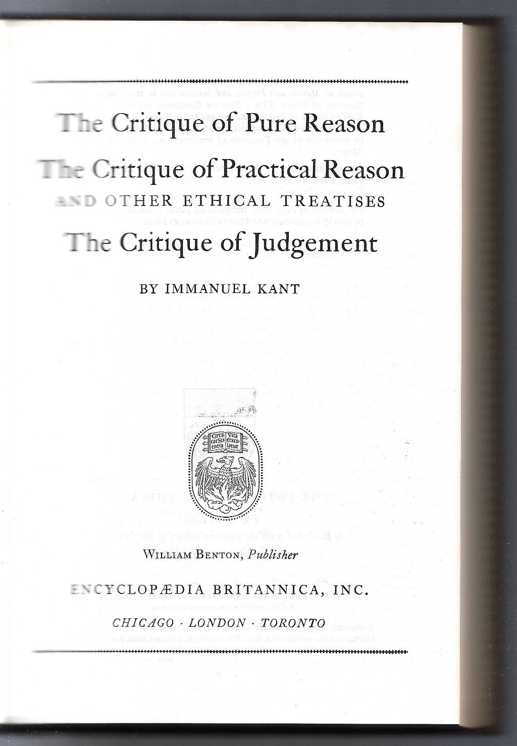 Libro vintage. Argomento: Saggio. Autore: Kant Immanuel. Editore: William Benton. Luogo: Chicago. Anno: 1952. Formato: in-8°. Pagg: 613. Legatura: Cartonata in similpelle. Collana: Great Books of the Western World 42. Conservazione: Buona. Testo in inglese. Piatto muto. Fregi al dorso. Piccolo difetto al dorso.