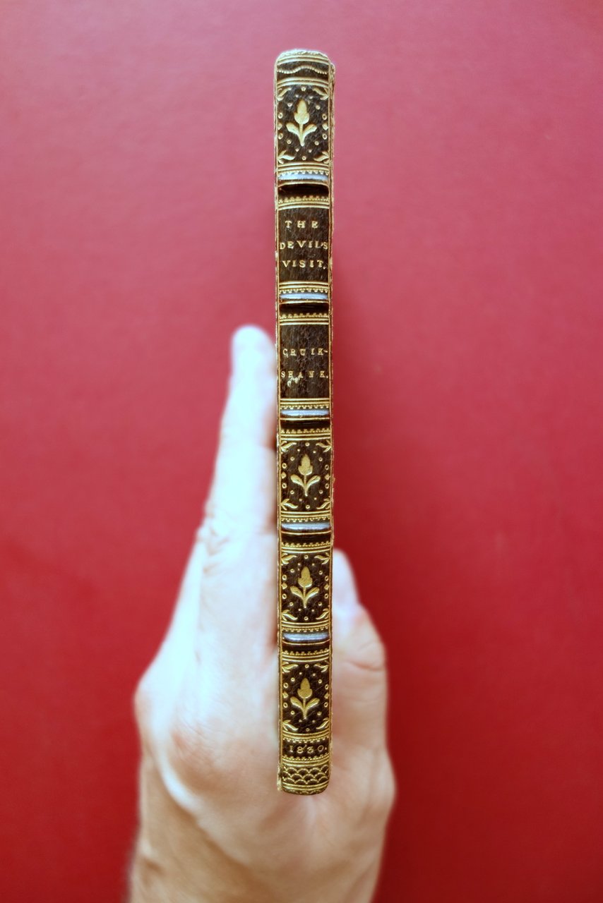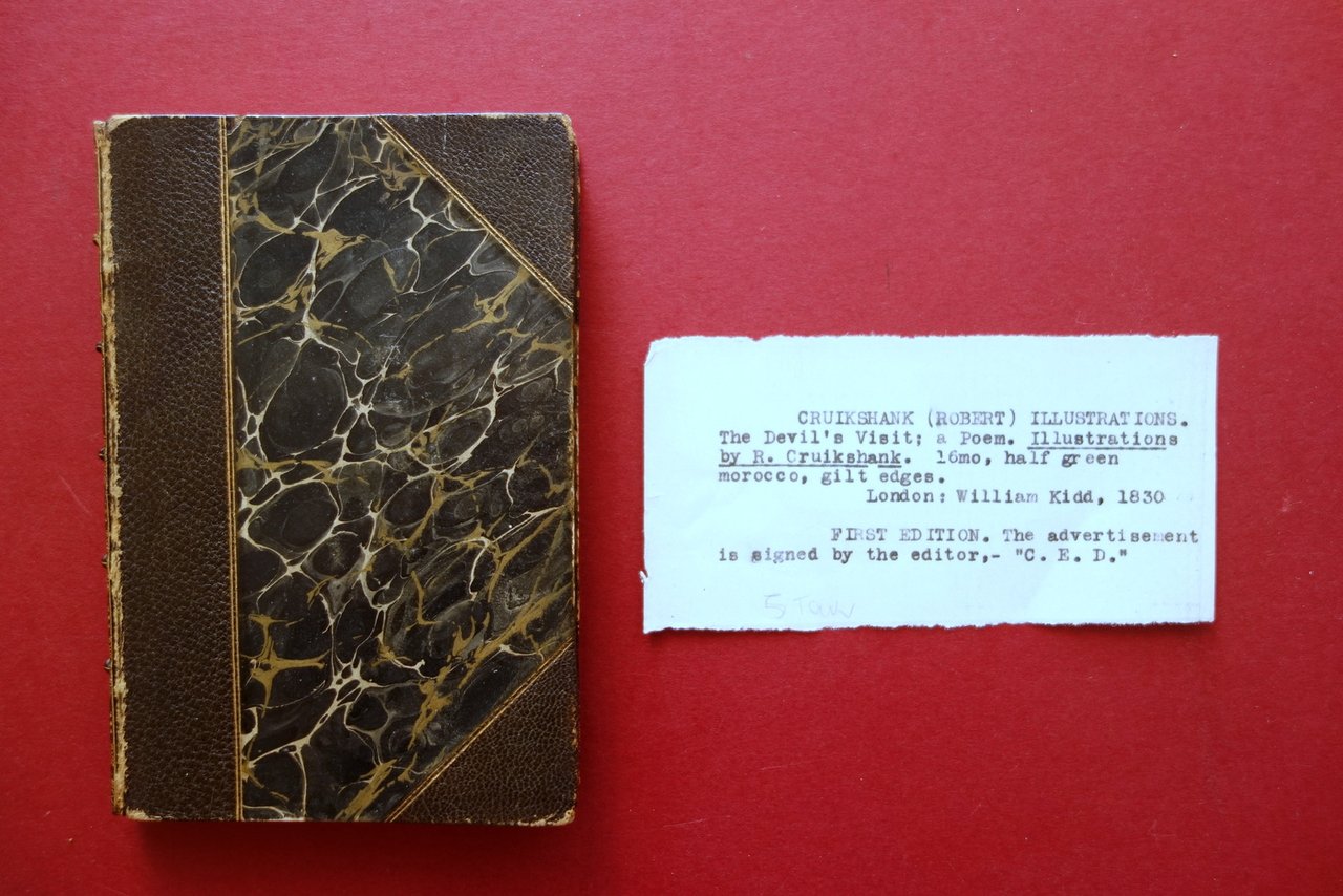 The Devil's Visit a poem from the original manuscript with notes by a barrister William Kidd, London 1830; cm 15x10; pp. 36 con 8 belle ill. in b/n nel t. e fuori t. realizzate da Robert Cruikshank; al termine del testo varie pagine bianche. Elegante legatura in mezza pelle (dorso e angoli) con titolo e fregi impressi in oro al dorso con nervature, piatti marmorizzati. Tagli dorati. Testo in inglese. Accluso schedino descrittivo del precedente collezionista, in lingua inglese. Condizioni di conservazione Esemplare in buone condizioni con tracce d'uso; coperta con alcune piccole abrasioni alle cerniere e ai margini dei piatti, angoli dei piatti con minuscole mancanze al rivestimento. Interni buoni con piccole lievi bruniture ad alcune pagine. Rara prima edizione del 1830, corredata da belle illustrazioni del celebre illustratore britannico Robert Cruikshank. SETT63.L21085 N P