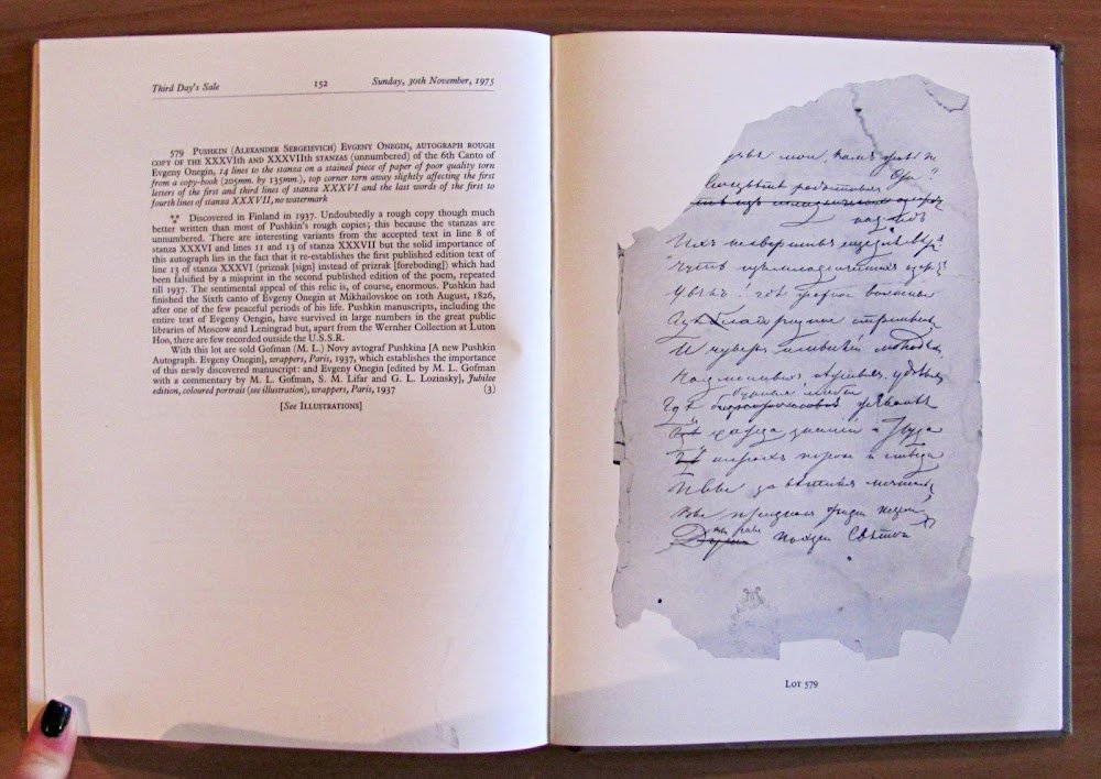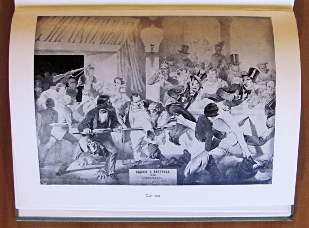 Bella tavola a colori in antiporta e molte illustrazioni in b/n n.t. Sotheby Parker Bernet Monaco S.A. - Monaco, 1975. Cartonato editoriale con fregi e titoli in oro e nero ai piatti e al dorso. Lieve imperfezione alla cuffia inferiore del dorso e piccola mancanza di colore al margine alto della retrocopertina. 19x25,5; pp.217. Splendido Catalogo d'Asta composto di 826 Lotti, di cui 32 illustrati, con rari libri russi tra i quali le prime edizioni di Dostoevskij, Gogol, Pushkin, Tolstoj e il primo libro russo stampato a Mosca nel 1564 oltre ad antichi opuscoli e spartiti musicali dal secolo XVI in poi. Ottimo stato.