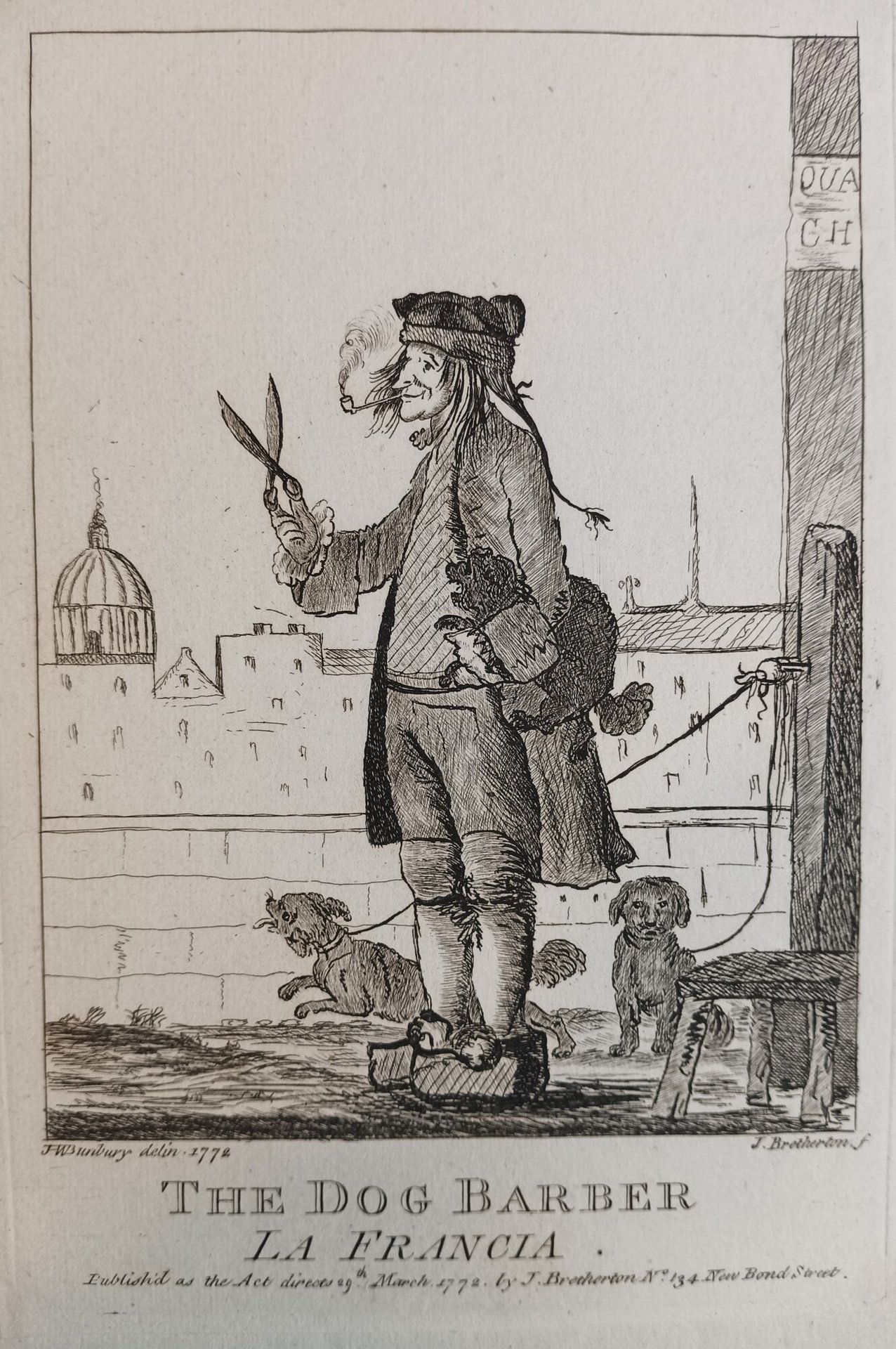 >Incisione originale a puntasecca (mm 255x172), firmata in basso a sinistra da H.W. Bunbury, caricaturista inglese che studiò a Roma: i suoi disegni erano solitamente incisi da Bretherton (firma in basso a destra). L'incisione rappresenta un barbiere per cani che tiene in mano un grosso paio di cesoie nell'intento di rasare un barboncino che si dimena sotto il suo braccio. Il toelettatore, che fuma una pipa, indossa una redingote ed un paio di zoccoli di legno, sulla testa un cappello da cui esce un lungo codino. Altri due cani legati ad un ceppo animano la scena. In alto a destra un'insegna parziale sembrerebbe indicare "Quai Chien". Vignetta umoristica molto particolare, ben conservata.
