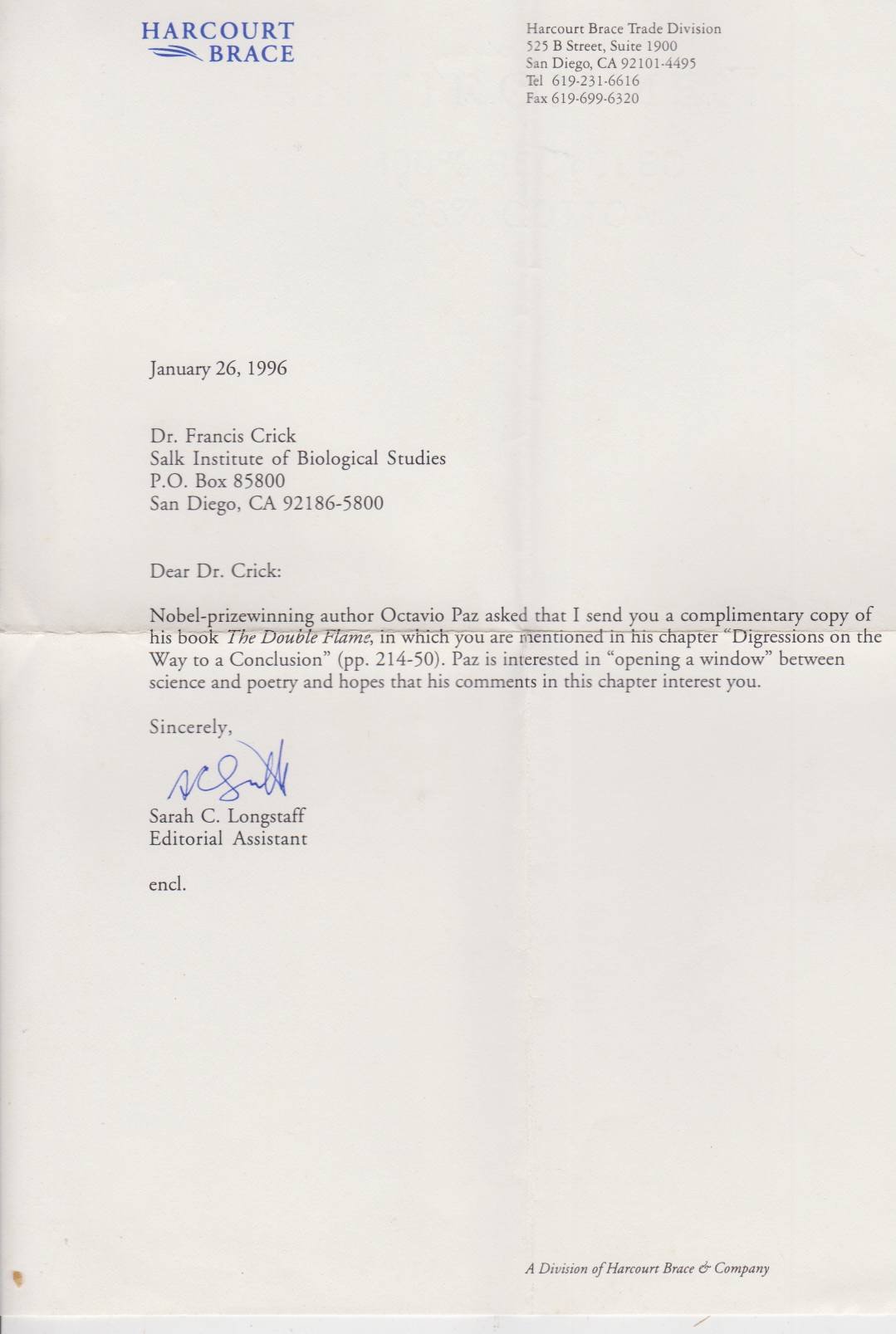 Library checkout card pocket (marked 'gift') inside front cover. Previous owner Crick's name & address stamp to front free endpaper ; From the personal library of Nobel laureate Francis Crick, with a letter laid in from the publisher stating that author Paz specifically requested that a copy be sent to Crick, as the latter is mentioned in a chapter; 12mo 7" - 7½" tall; 276 pages