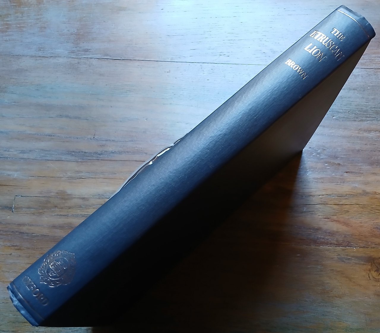 (Rappresentazione del leone nell'arte etrusca; Animali nell'arte antica; Etruria; Etruschi; Archeologia) In 4°, legatura editoriale in piena tela blu, titoli e fregio impressi in oro al dorso, pp. XXVI,209,(3), con un ritratto fotografico dell'Autore in antiporta, una mappa dell'Etruria e 64 tavole fuori testo con numerose immagini fotografiche in bianco e nero. Prefazione di John Davidson Beazley. Collana : "Oxford monographs on classical archaeology". diretta da J. D. Beazley e Bernard Ashmole. Prima edizione. Volume ben conservato.