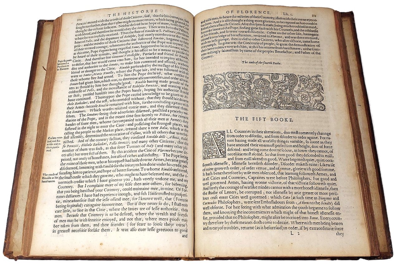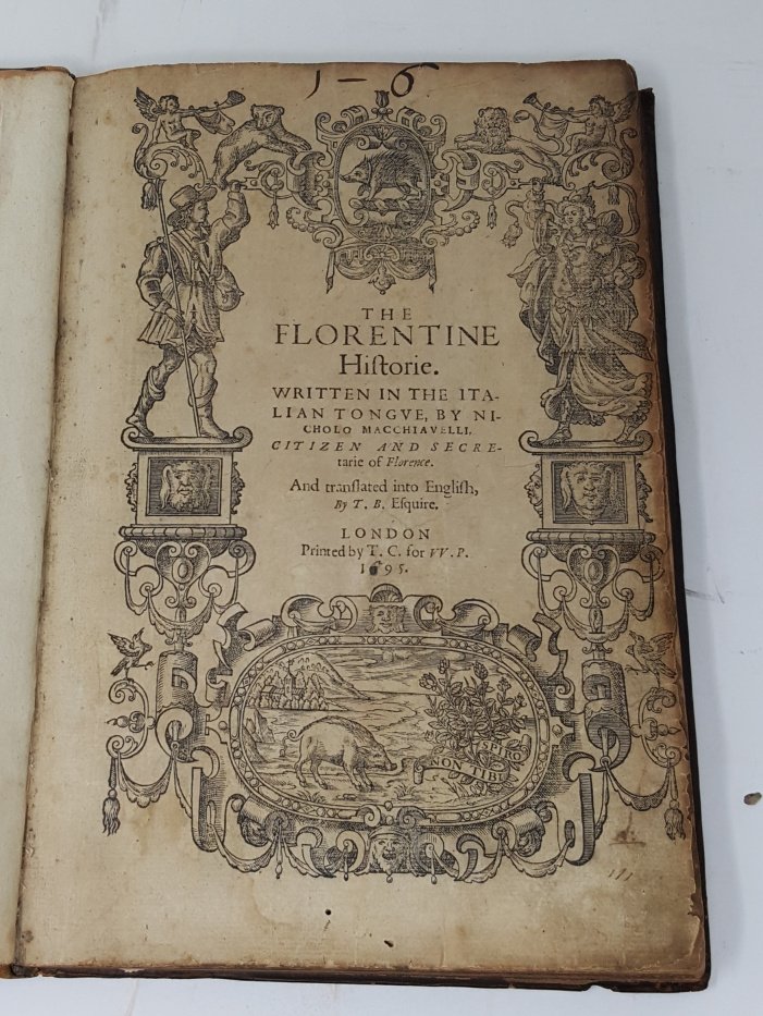>in-4 (274x176), (12), 222, buona legatura inglese seicentesca in pieno cuoio con dorso a nervetti abilmente rifatto: ai piatti cornice formata da triplice ordine di filetti, fregi floreali ai 4 angoli con iniziali “I.O.W.”, il tutto impresso a secco; piccoli difetti agli angoli. Titolo entro elaborata bordura architettonica incisa in legno animata da personaggi sulle due colonne laterali, animali e allegorie; in basso grande medaglione racchiude un cinghiale con il motto “Spiro non tibi”. Elaborati frontalini ed inziali ornate all'inizio di ciascun capitolo. Prima edizione inglese delle Historie, che furono commissionate dalla Famiglia Medici al Machiavelli per rimediare alle vicende del 1513 – accuse di cospirazione, tortura, arresti domiciliari - e che uscirono postume nel 1532. "The first example in Italian literature of a national biography" la definì l'Encicl. Britannica. La traduzione si deve a Thomas Bedingfield - che già aveva lavorato al De Consolatione (1542) di Cardano - e precede di quasi mezzo secolo quella del “Principe”, testimoniando la diffusione di Machiavelli nell'Inghilterra di fine Cinquecento. Le sue fortune furono condizionate dal rapporto dualistico che la Gran Bretagna ebbe con l'Italia: in un primo tempo Machiavelli era molto ammirato dalla cultura inglese come profondo pensatore e scrittore di genio; poi divenne l'incarnazione delle forze e delle dottrine cattoliche europee contro le quali stava combattendo l'emergente stato protestante inglese. Il machiavellismo influenzò la morale e la politica inglese ai tempi di Thomas More, William Shakespeare, Walter Raleigh, Francis Bacon, Thomas Hobbes e John Milton. E Nicolò diventò sinonimo di ateismo e di un modo infido di eliminare il proprio modello di “Principe”, nonché addirittura un personaggio sul palcoscenico elisabettiano.
