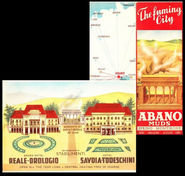 The fuming City. Abano muds, spring Montirone, baths, inhalations, accessory, cures. Grand Hotel Reale Orologio. Hotel Savoia Todeschini. Pieghevole sagomato.